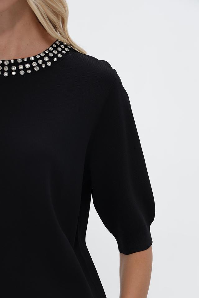 Пуловер имеет прямой крой и короткий рукав, что обеспечивает комфорт и свободу движений. Особый акцент в этом изделии – изящный декор из мелких бусин, украшающий горловину. Он придаёт изделию элегантность и изысканность.