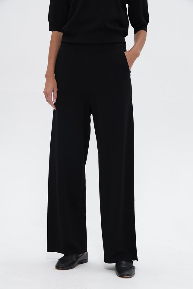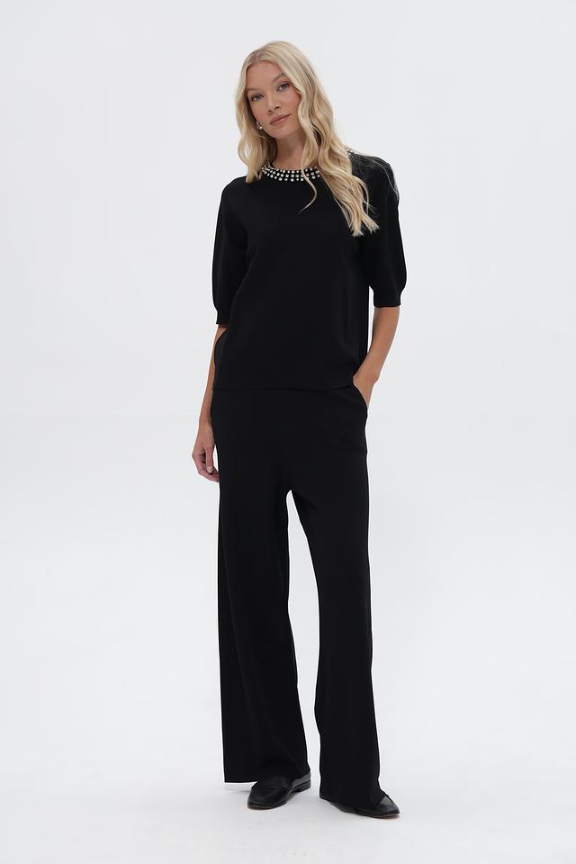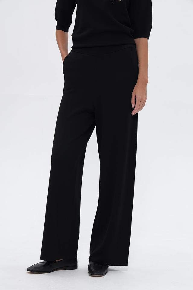 Брюки имеют крой палаццо, обеспечивающий свободу движений и создающий элегантный силуэт. Высокая посадка подчеркивает талию и визуально удлиняет ноги.