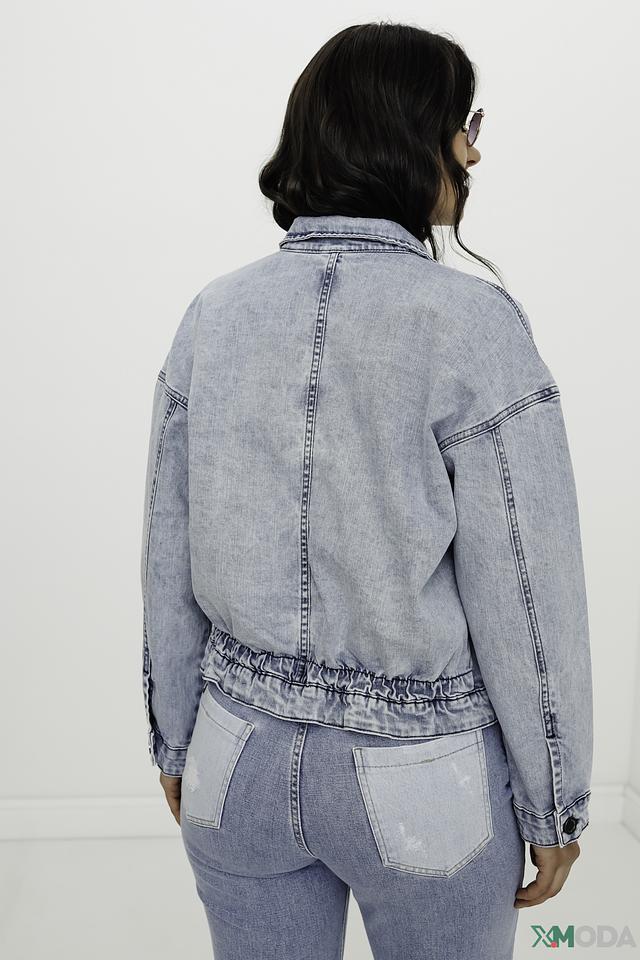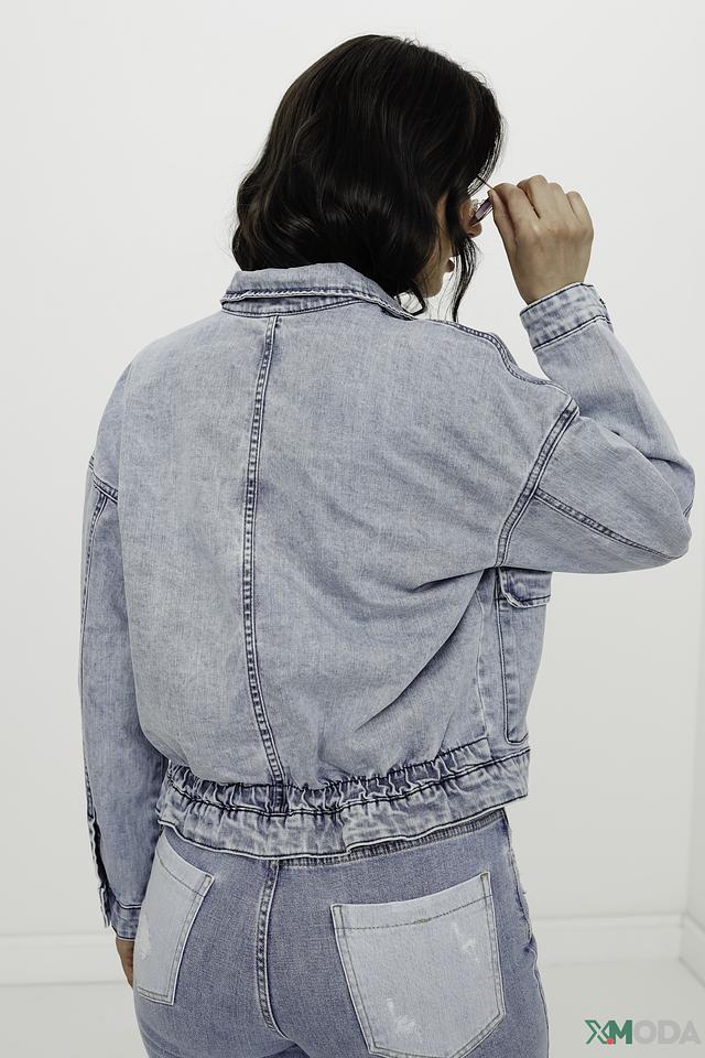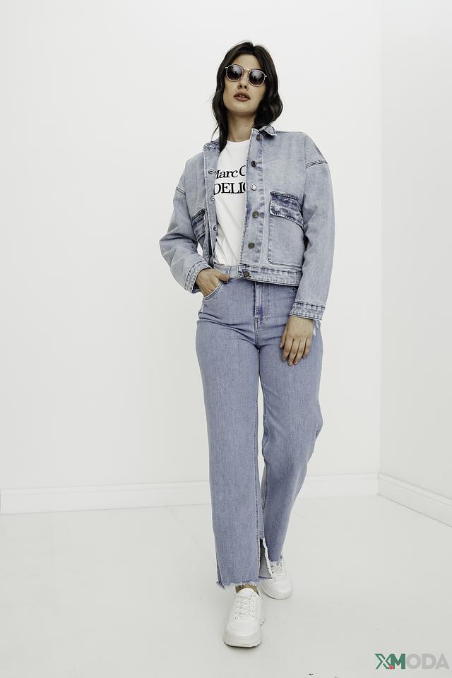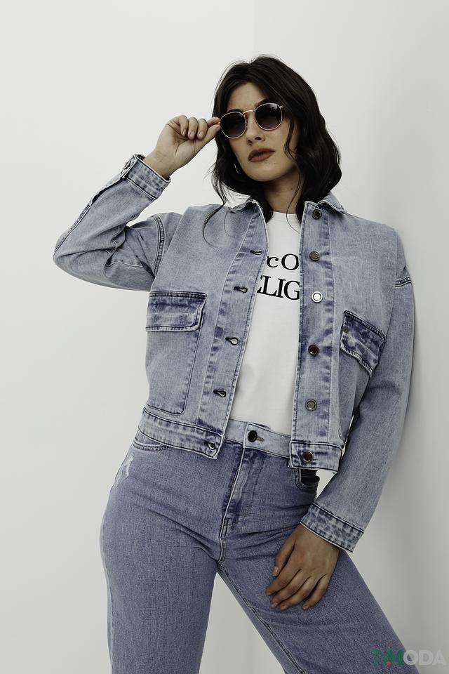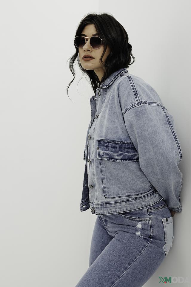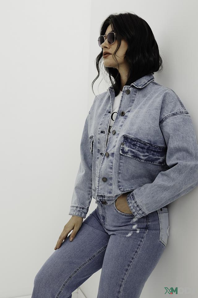 Жакет имеет классический крой с отложным воротником и застежкой на пуговицы. Накладные карманы добавляют практичности и непринужденности образу. Текстура денима с эффектом потертости придает жакету винтажный вид.