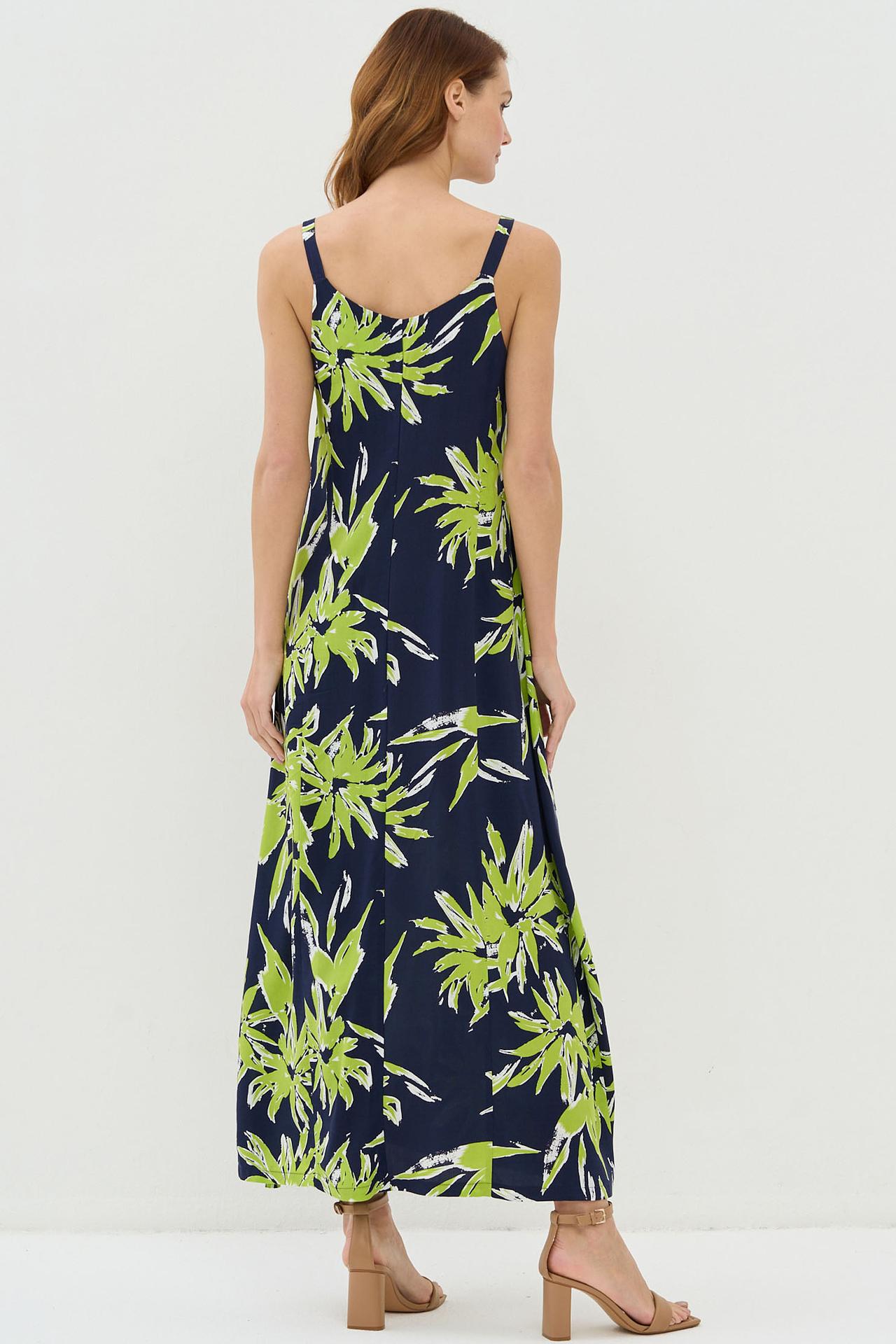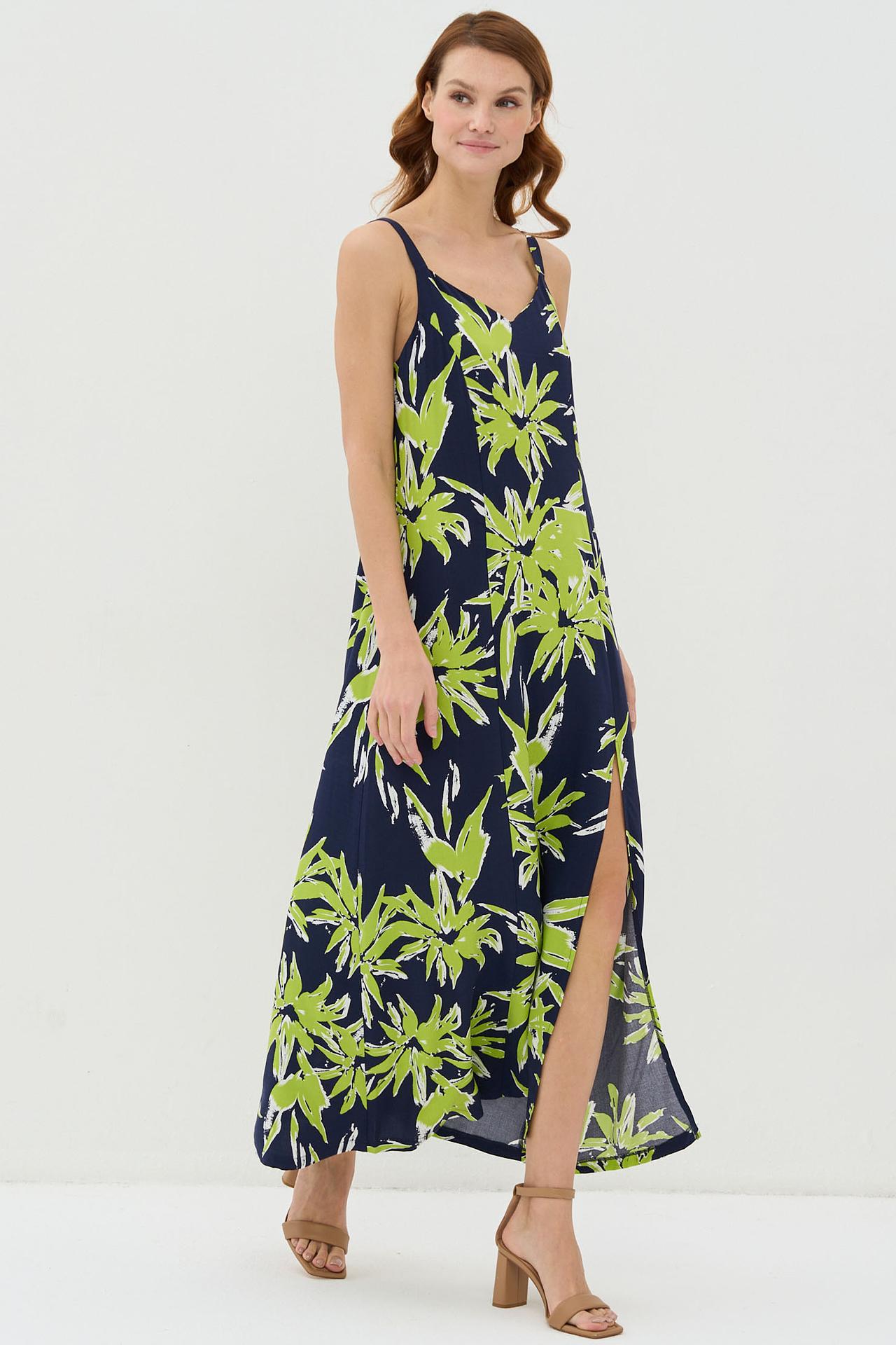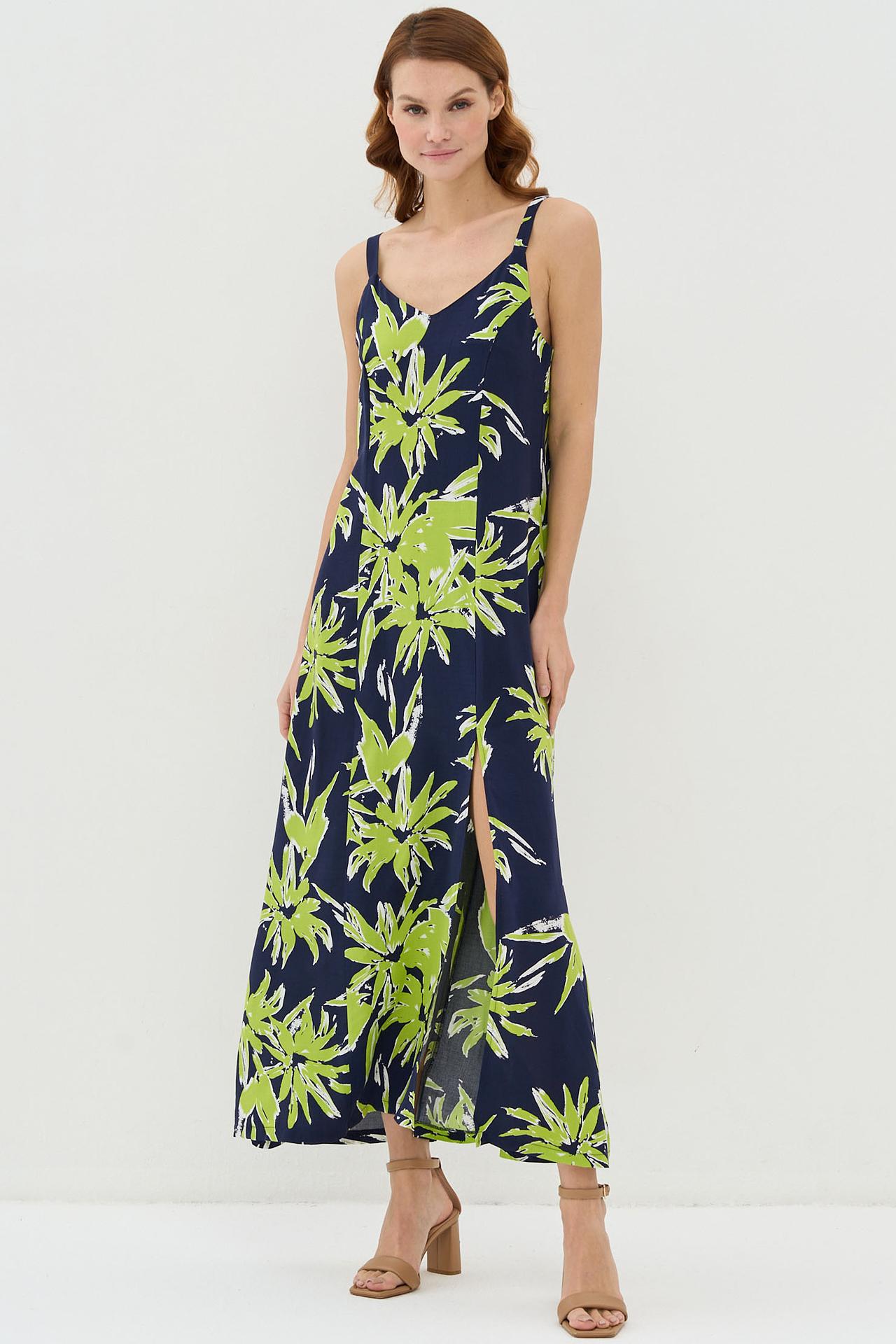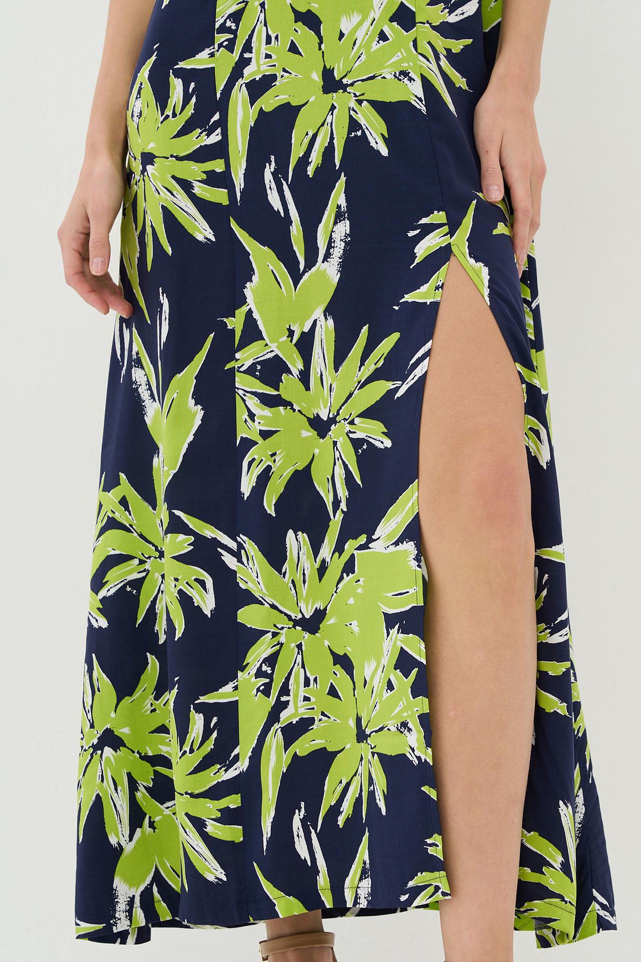 Длинное платье VAY синее с зелёным принтом и разрезом