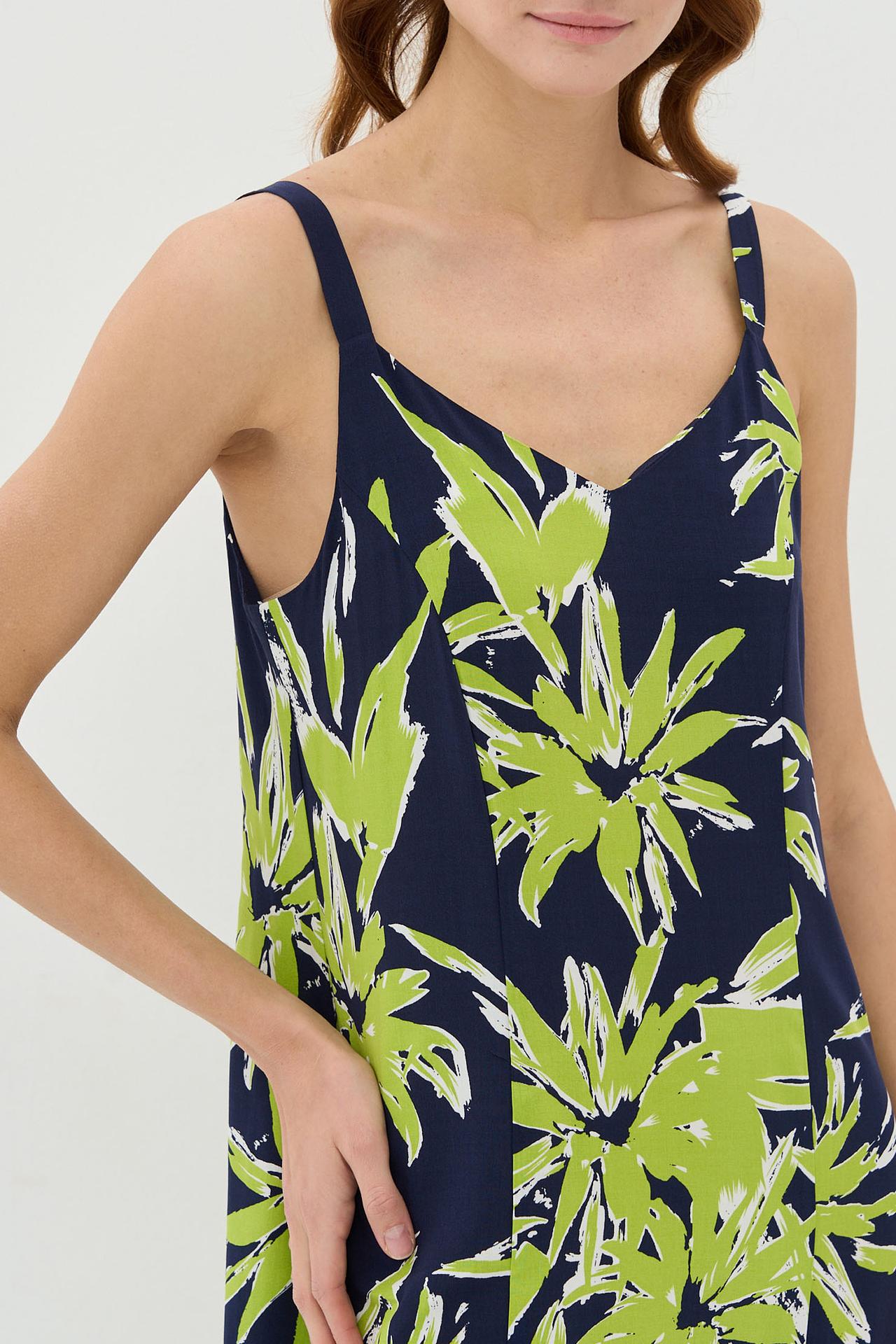 - Яркий принт. Выразительный тропический принт с элементами зелёного и белого на тёмно-синем фоне добавляет образу свежести и динамичности. Платье с принтом подчеркнет вашу индивидуальность.