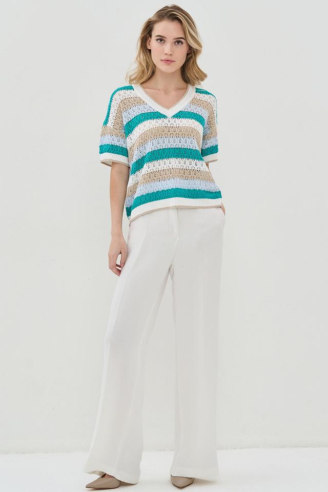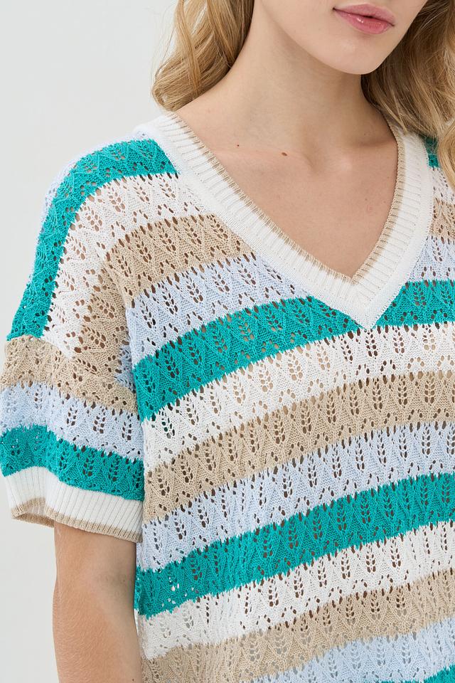 Женский джемпер VAY голубого цвета с короткими рукавами выполнен в полосатом дизайне. Модель имеет V-образный вырез и лёгкую, ажурную вязку, идеально подходит для создания летних образов. Состав: хлопок 50%, пан 50%