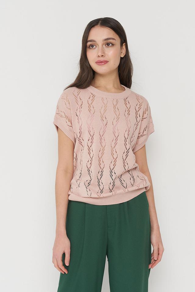 Бежевый джемпер от VAY с ажурной вязкой и короткими рукавами станет стильным дополнением к вашему гардеробу. Модель выполнена из мягкого и приятного к телу сочетания хлопка и пан. Состав: хлопок 50%, пан 50%