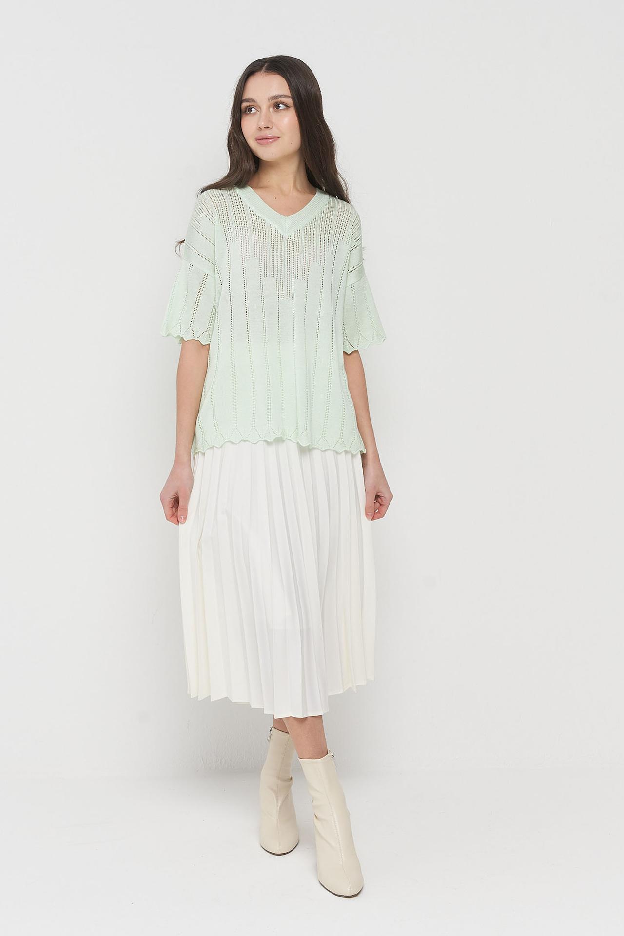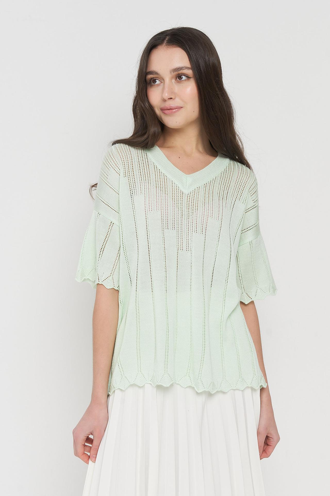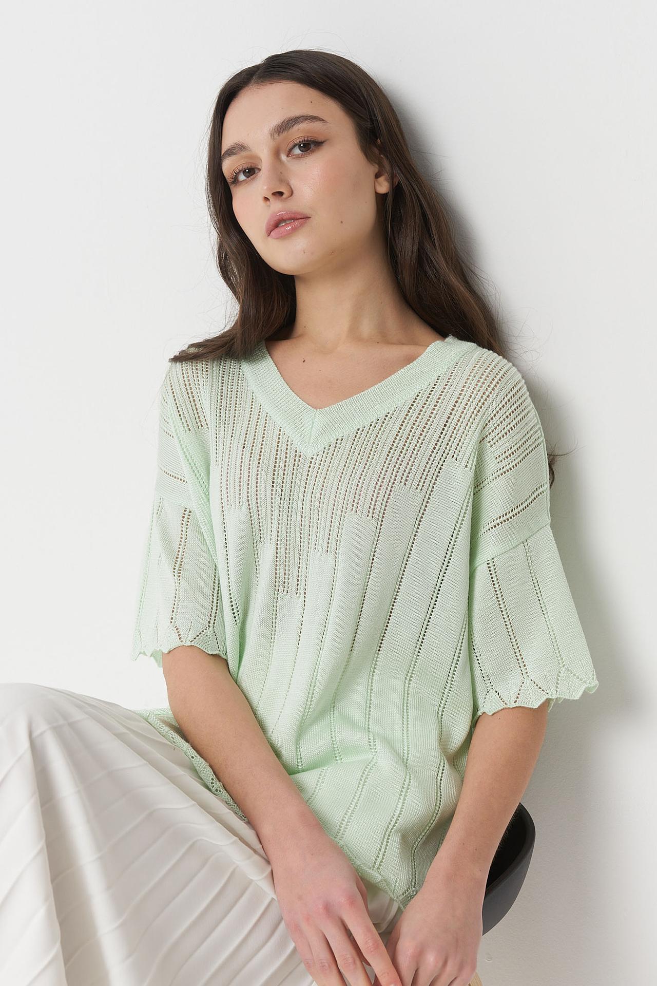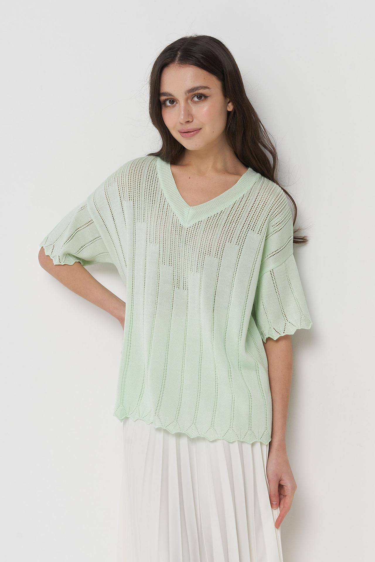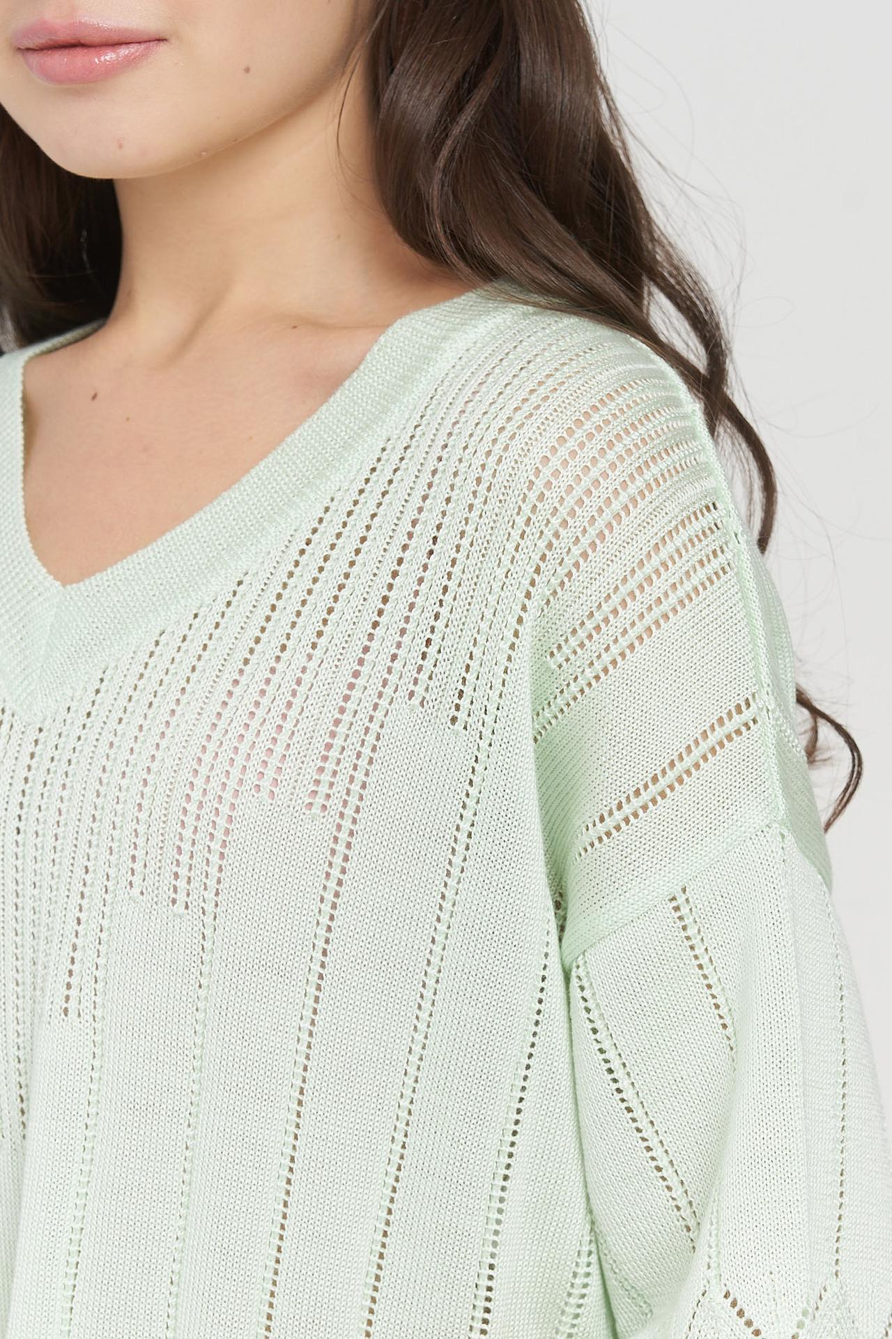 Изделие выполнено в нежном мятном оттенке, который освежает образ и добавляет ему легкости. Пуловер отлично подойдет для повседневной носки, а также для создания расслабленных летних образов.