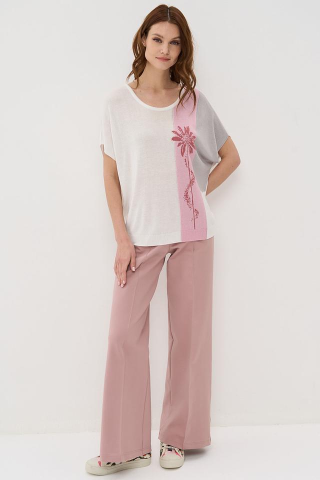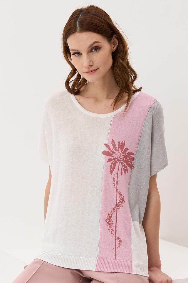 Женский джемпер VAY нежно-розового, серого и бежевого цвета с цветочным принтом. Модель выполнена из мягкого трикотажа с короткими рукавами и округлым вырезом горловины. Состав: