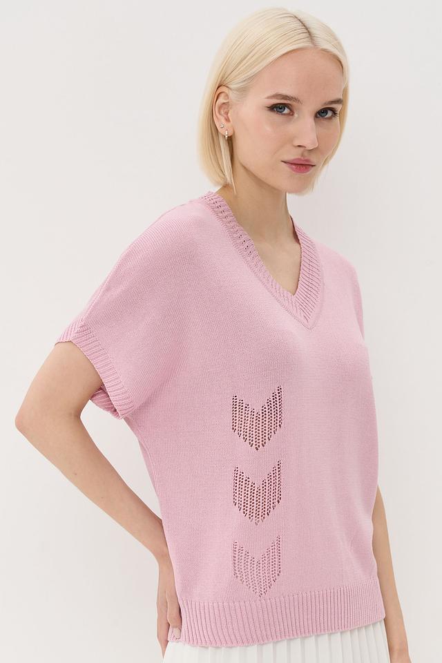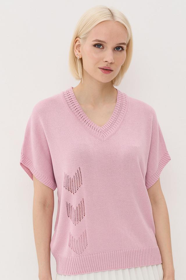 Модель отличается V-образным вырезом и короткими рукавами, что делает ее идеальным вариантом для теплой погоды. Особый шарм изделию придают декоративные элементы в виде вырезанных сердечек, расположенных по центру переда.