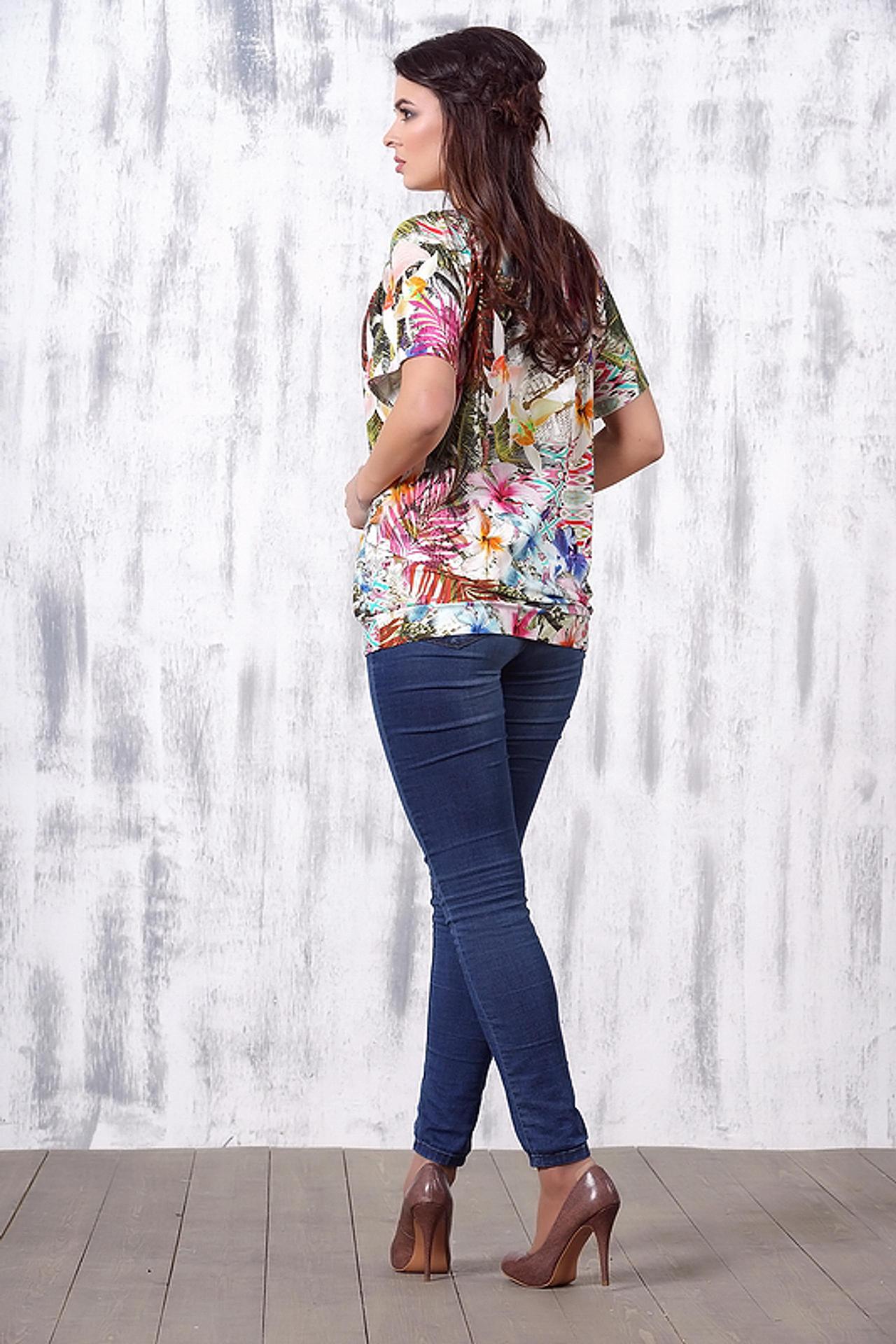 - Яркий тропический принт. Блуза украшена эффектным тропическим узором с разноцветными листьями и цветами, что делает ее идеальным выбором для создания летних и жизнерадостных образов. Этот сочный дизайн привлекает внимание и поднимает настроение.