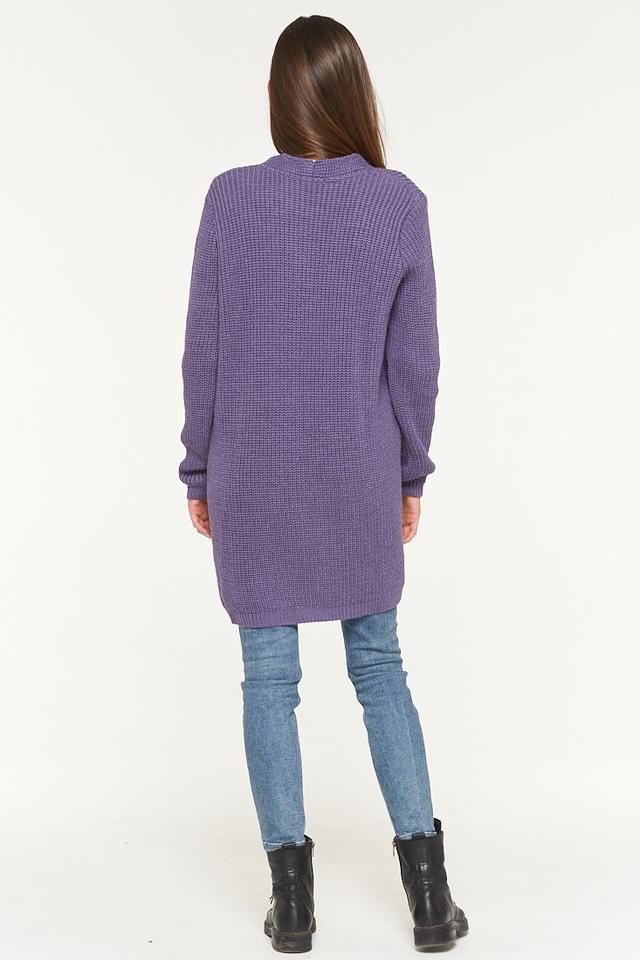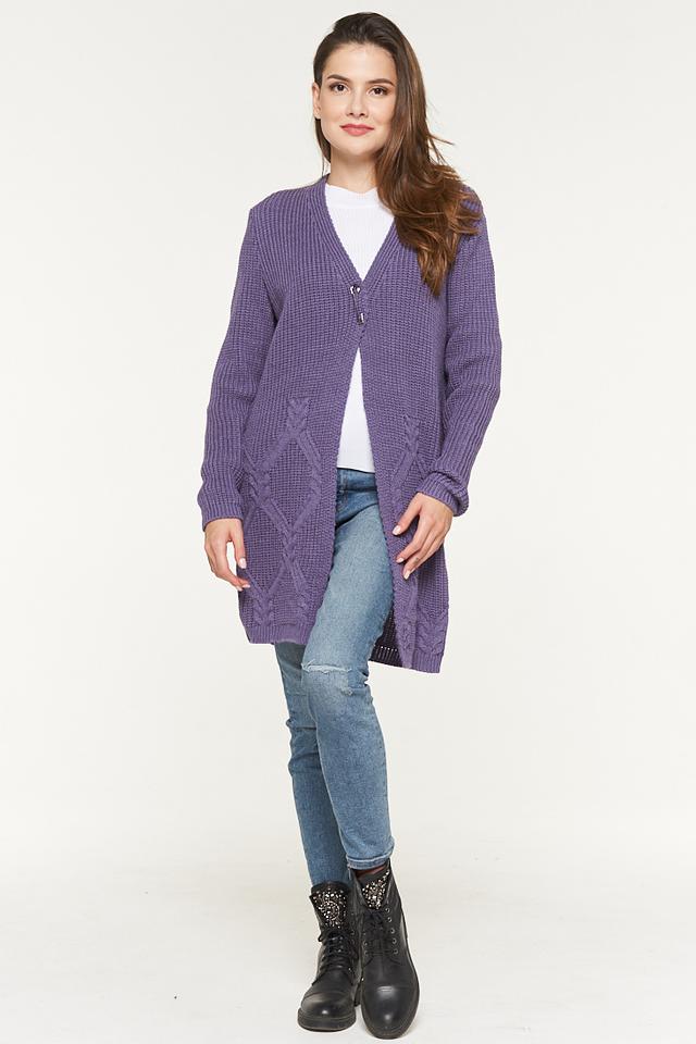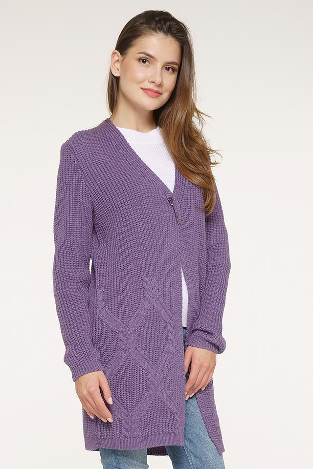 Кардиган имеет лиловый цвет и выполнен в вязаной текстуре. Удлиненный крой позволяет носить его с различными предметами одежды, от джинсов до платьев. Застежка на пуговицы обеспечивает удобство и позволяет регулировать степень тепла.