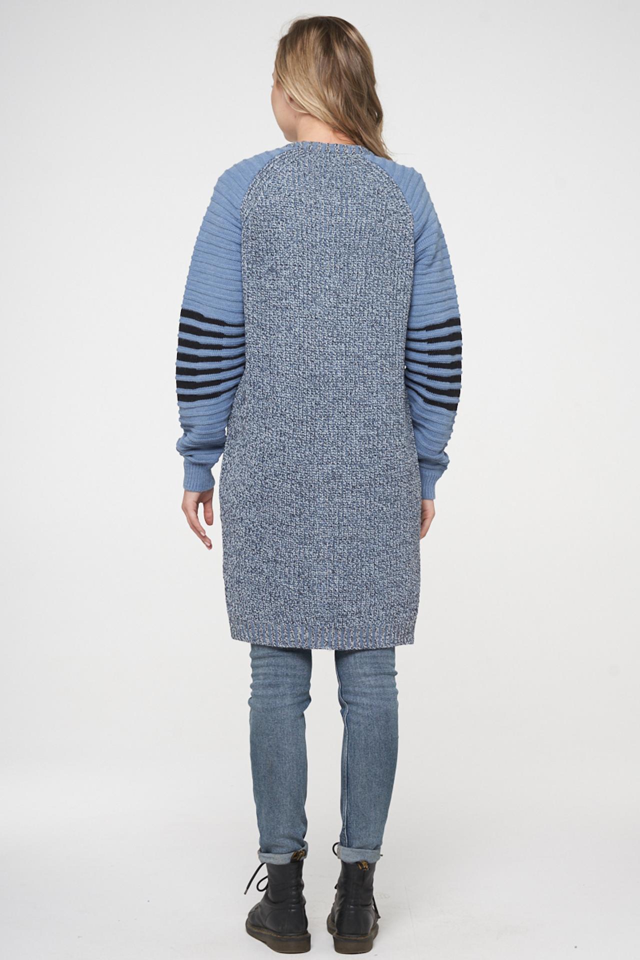 Кардиган застегивается на пуговицы, что позволяет регулировать степень тепла и создавать разные стили. Рукава украшены черными полосками, добавляющими образу динамичности и современности. Этот кардиган станет отличным дополнением к вашему повседневному или деловому гардеробу. Купите сейчас и наслаждайтесь комфортом и стилем каждый день!