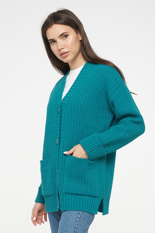 Женский кардиган VAY изумрудного цвета выполнен из мягкого трикотажа с рельефной фактурой. Модель с V-образным вырезом и застёжкой на пуговицы дополнена удобными карманами. Состав: пан 70%, шерсть 30%