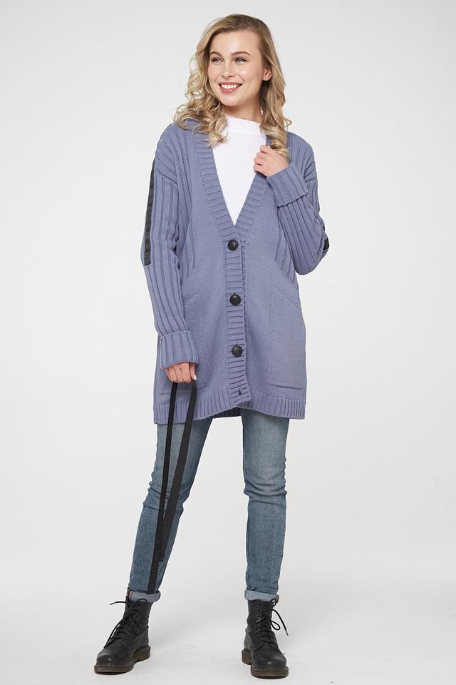 Кардиган имеет свободный крой, V-образный вырез и застегивается на крупные пуговицы. Декоративные вязаные вставки на плечах придают модели оригинальность и стиль.