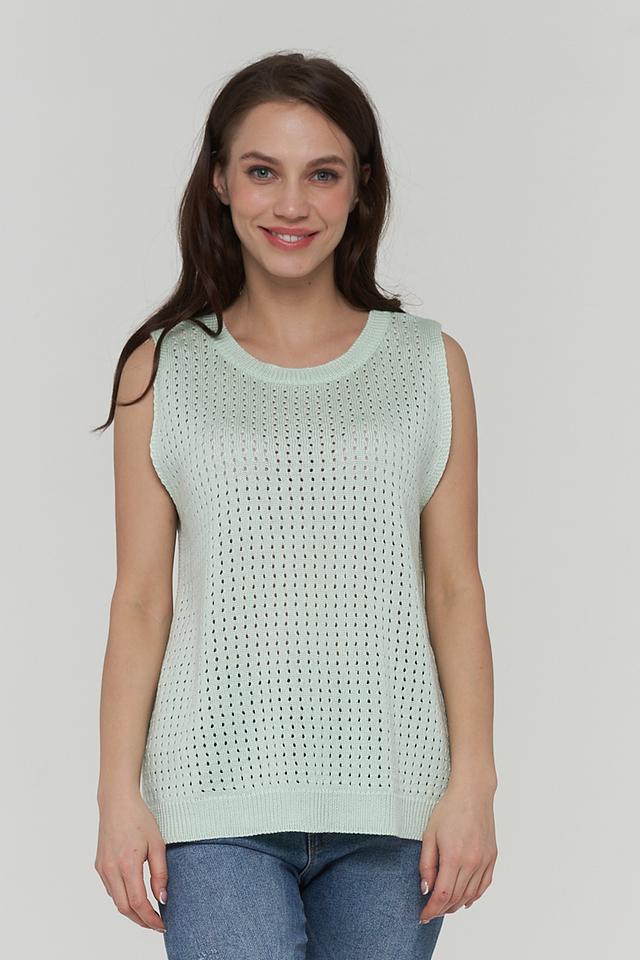 Женский жилет VAY мятного цвета выполнен из лёгкого трикотажа с ажурной вязкой. Модель без рукавов с округлым вырезом горловины станет отличным дополнением к летнему гардеробу. Состав: вискоза 50%, пан 30%, хлопок 20%