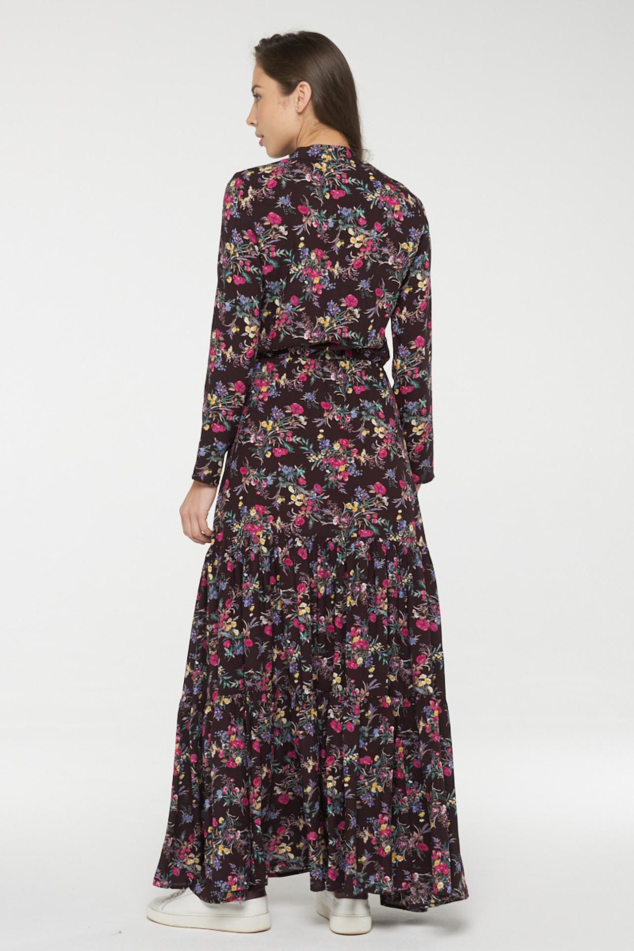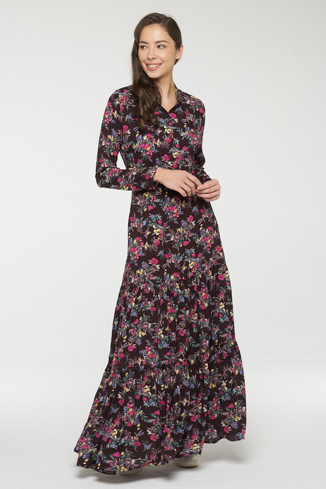- Дизайн и принт: Платье украшено изящным цветочным принтом на глубоком фоне, что придает изделию утонченный и запоминающийся вид. Макси длина и ярусный подол создают струящийся, воздушный силуэт.