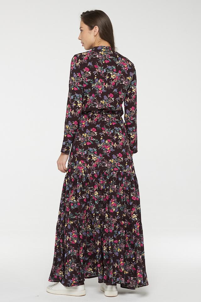 Особенностью этого платья является яркий цветочный принт на темно-сливовом фоне. Он добавляет образу легкости и романтичности. Платье идеально подойдет для создания как повседневных, так и вечерних образов.