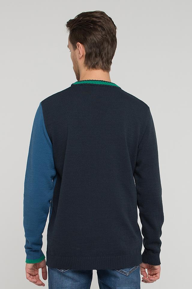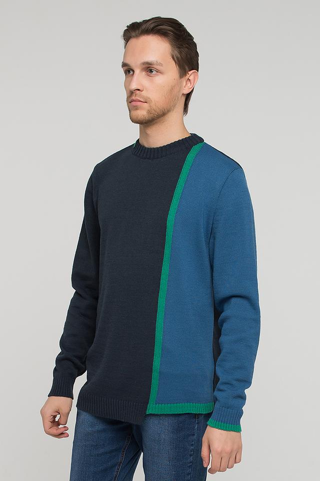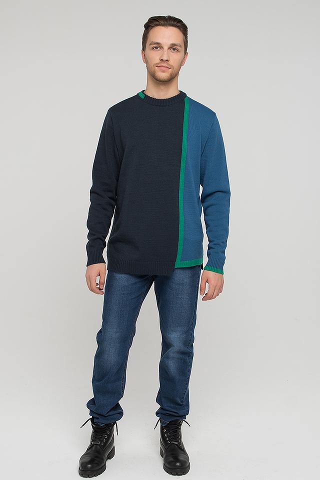 Мужской джемпер VAY синего и графитового цвета с оригинальным цветовым блоком и зелёной отделкой. Изготовлен из мягкой и приятной к телу смеси хлопка и шерсти, обеспечивающей комфорт и тепло. Состав: пан 70%, шерсть 30%