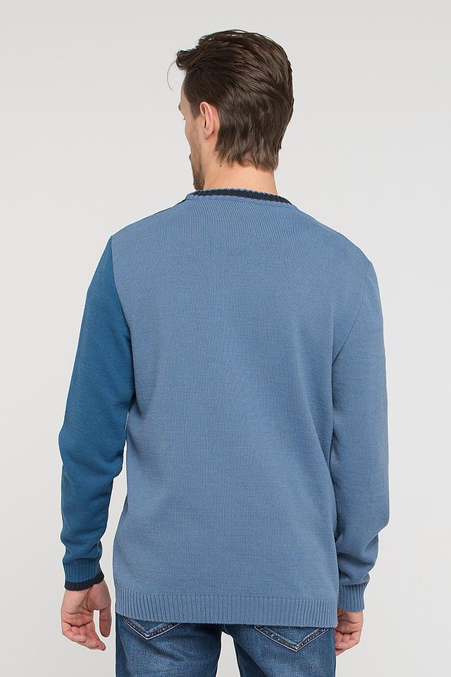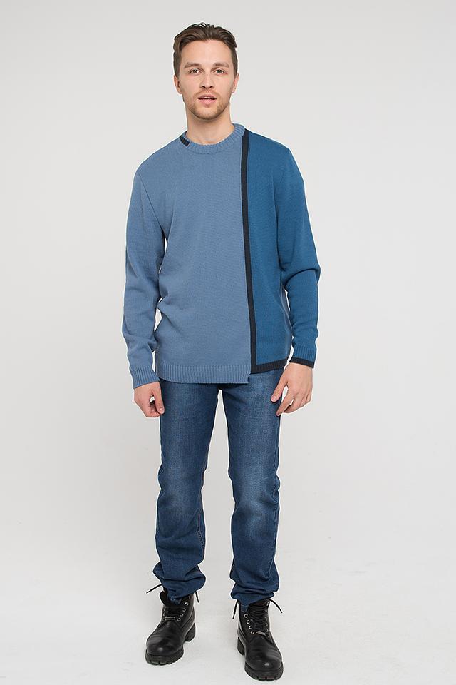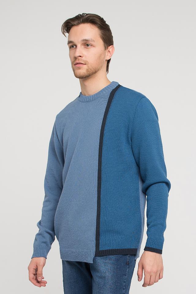 Мужской джемпер VAY голубого и синего цвета с оригинальным дизайном. Изготовлен из сочетания шерсти и хлопка, обеспечивая комфорт и тепло. Отличается интересным цветовым блоком и аккуратным исполнением. Состав: пан 70%, шерсть 30%