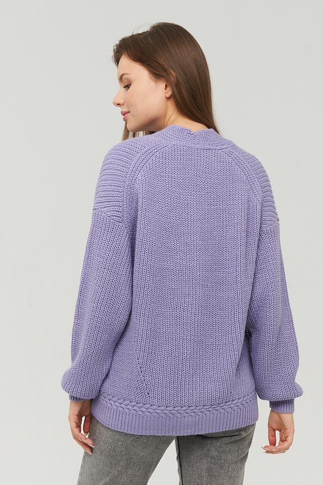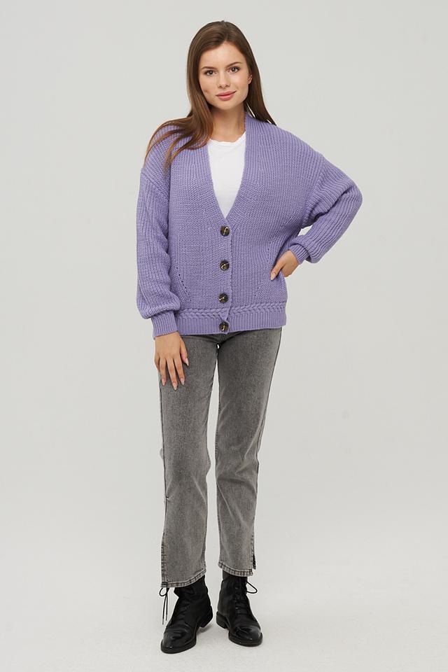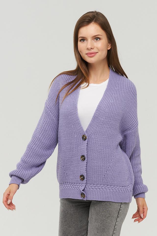 Кардиган имеет лавандовый цвет и свободный крой, который позволяет легко сочетать его с различными стилями одежды. V-образный вырез и застёжка на пуговицы придают модели классический вид.