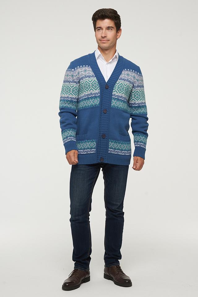 Мужской кардиган VAY синего цвета с традиционным жаккардовым узором. Модель выполнена из мягкой смеси шерсти и акрила, имеет V-образный вырез и застежку на пуговицы. Состав: пан 70%, шерсть 30%
