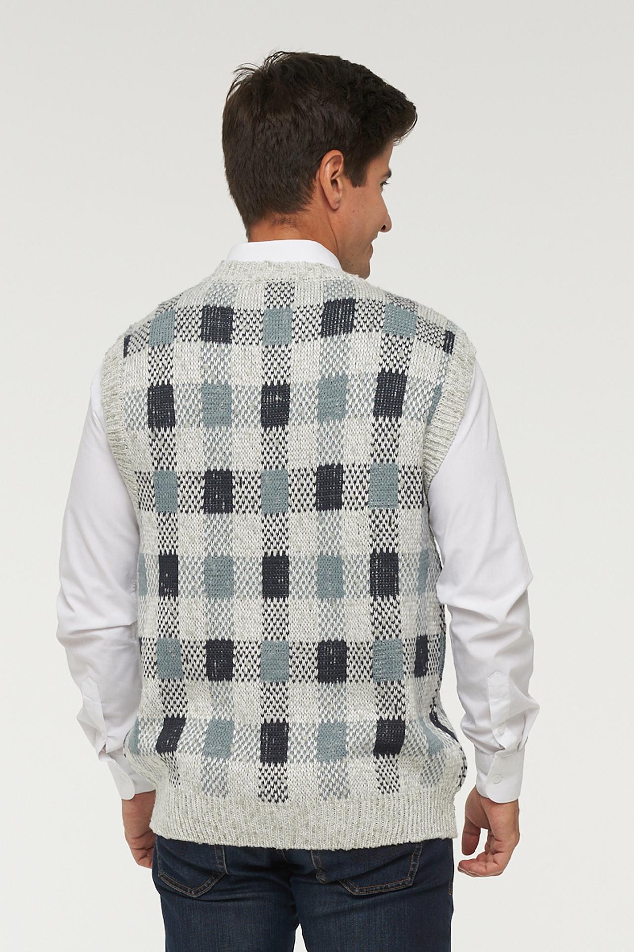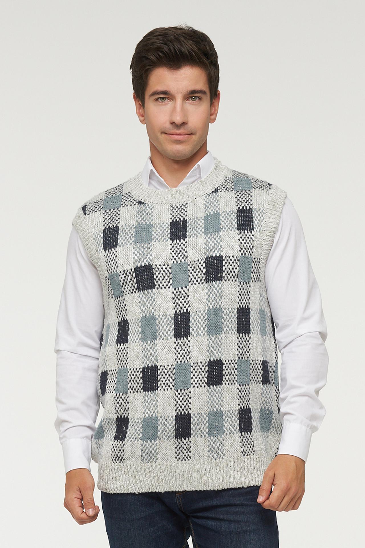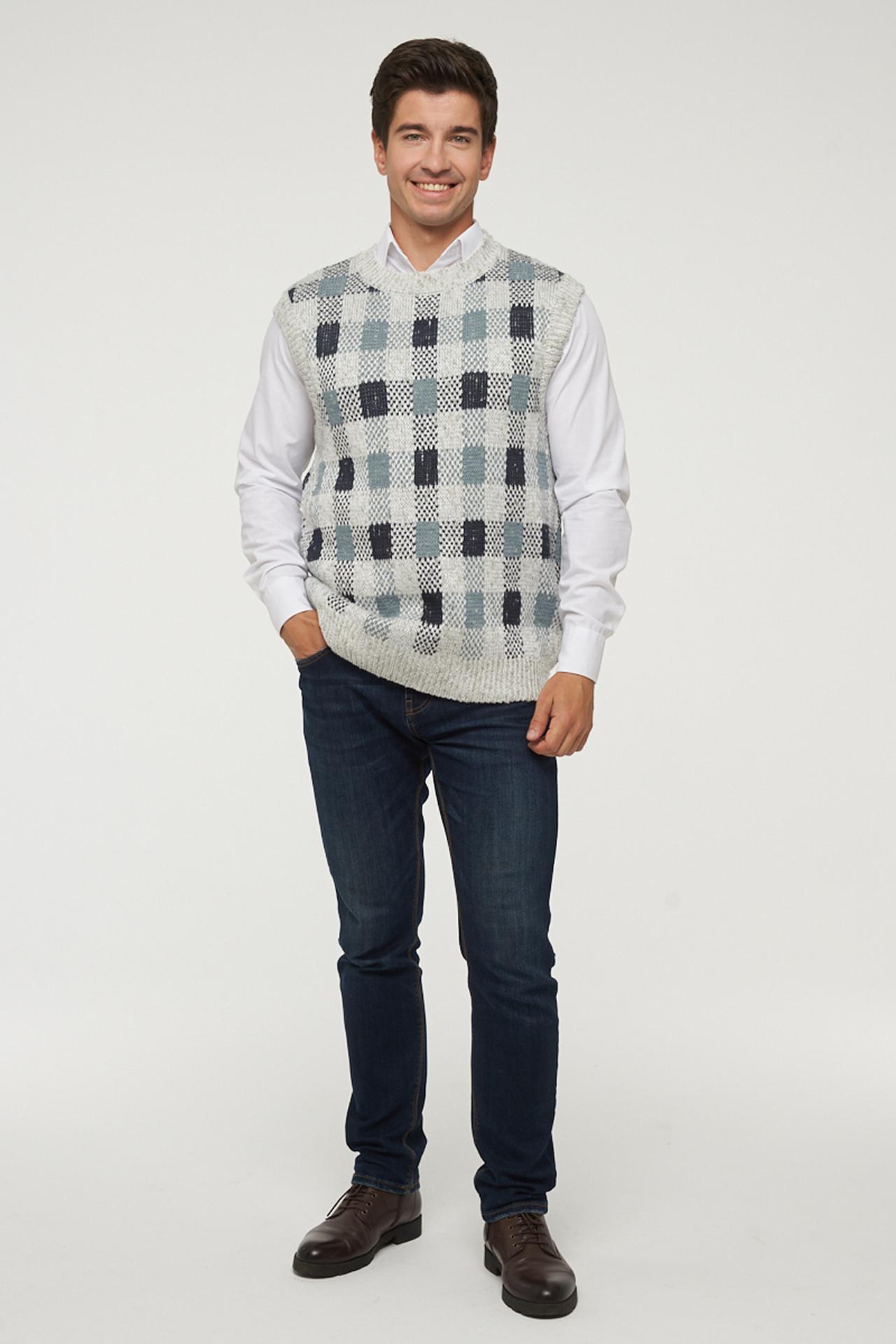 Стильный мужской жилет VAY – идеальное дополнение к вашему повседневному образу. Созданный из качественной смесовой пряжи, он обеспечивает комфорт и тепло в прохладную погоду. Оригинальный клетчатый узор в серых, синих и голубых тонах делает эту модель особенно привлекательной.