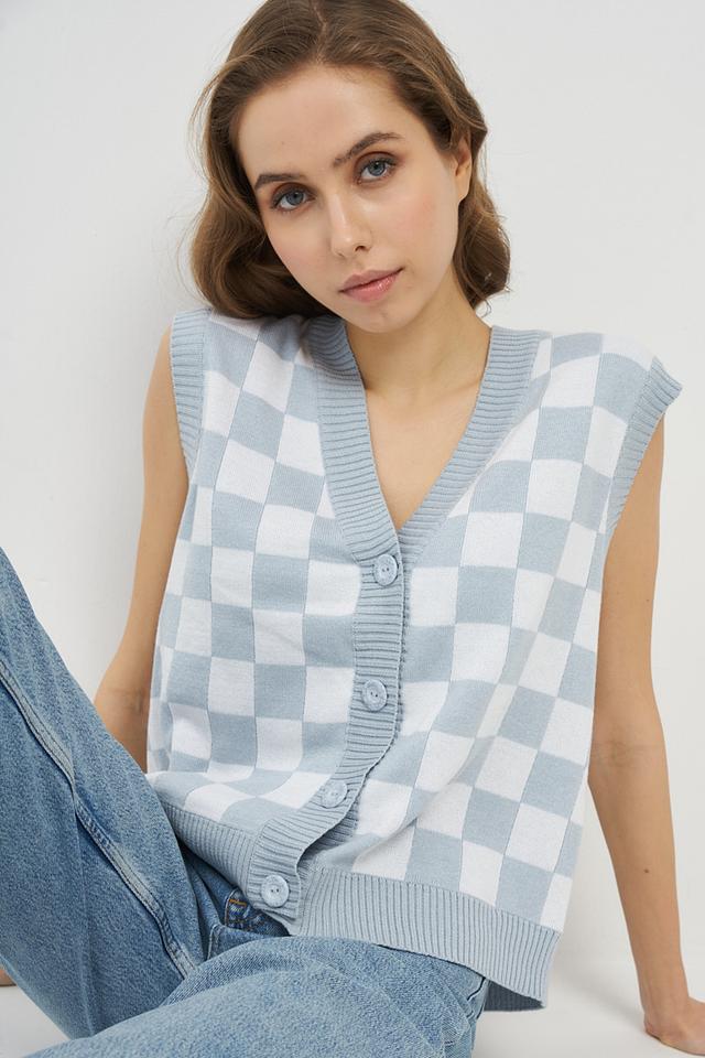 Этот стильный жилет от VAY станет отличным дополнением к вашему гардеробу. Он выполнен в приятном голубом цвете и украшен классическим клетчатым принтом, который придает образу свежесть и динамичность.