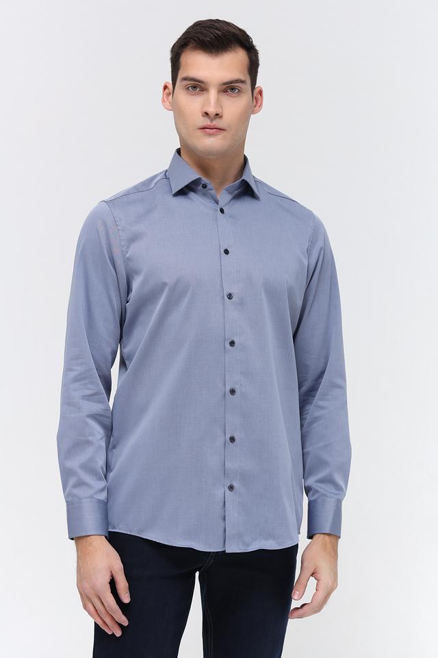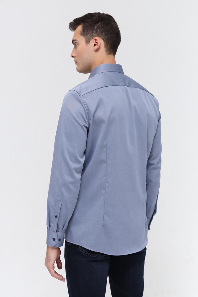 Рубашка имеет классический крой с длинными рукавами и приталенный силуэт, который подчеркивает фигуру. Застежка на пуговицах по всей длине обеспечивает удобство надевания и снятия. Воротник рубашки классической формы.