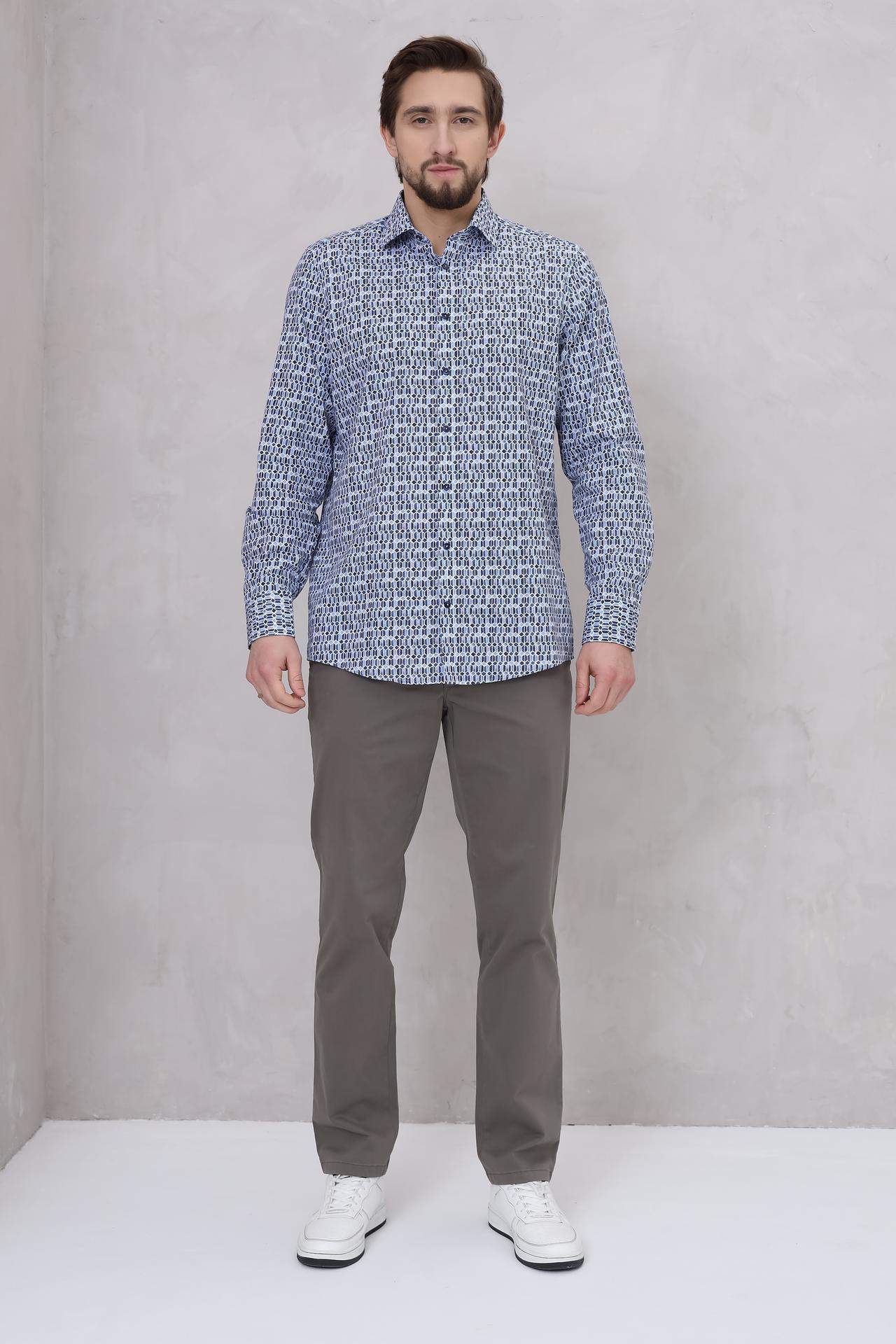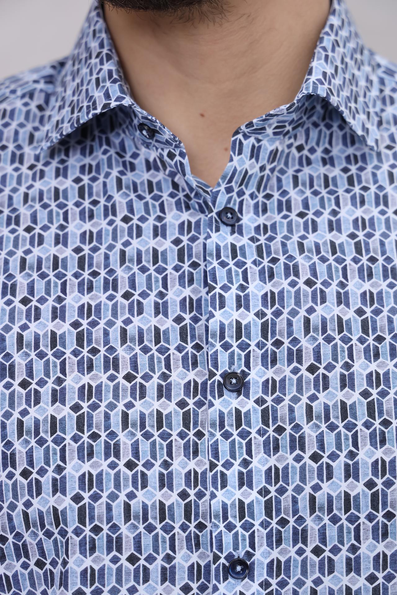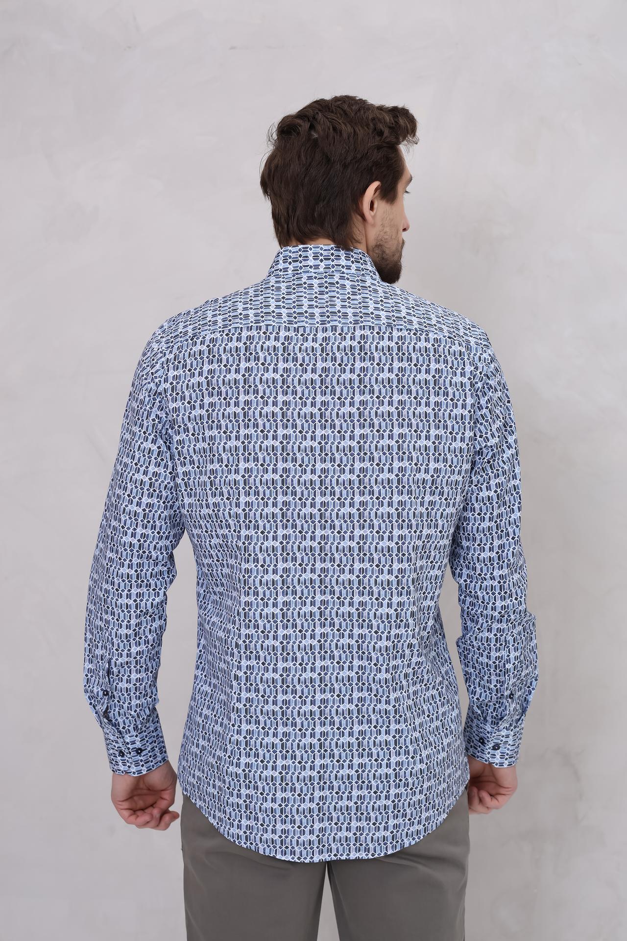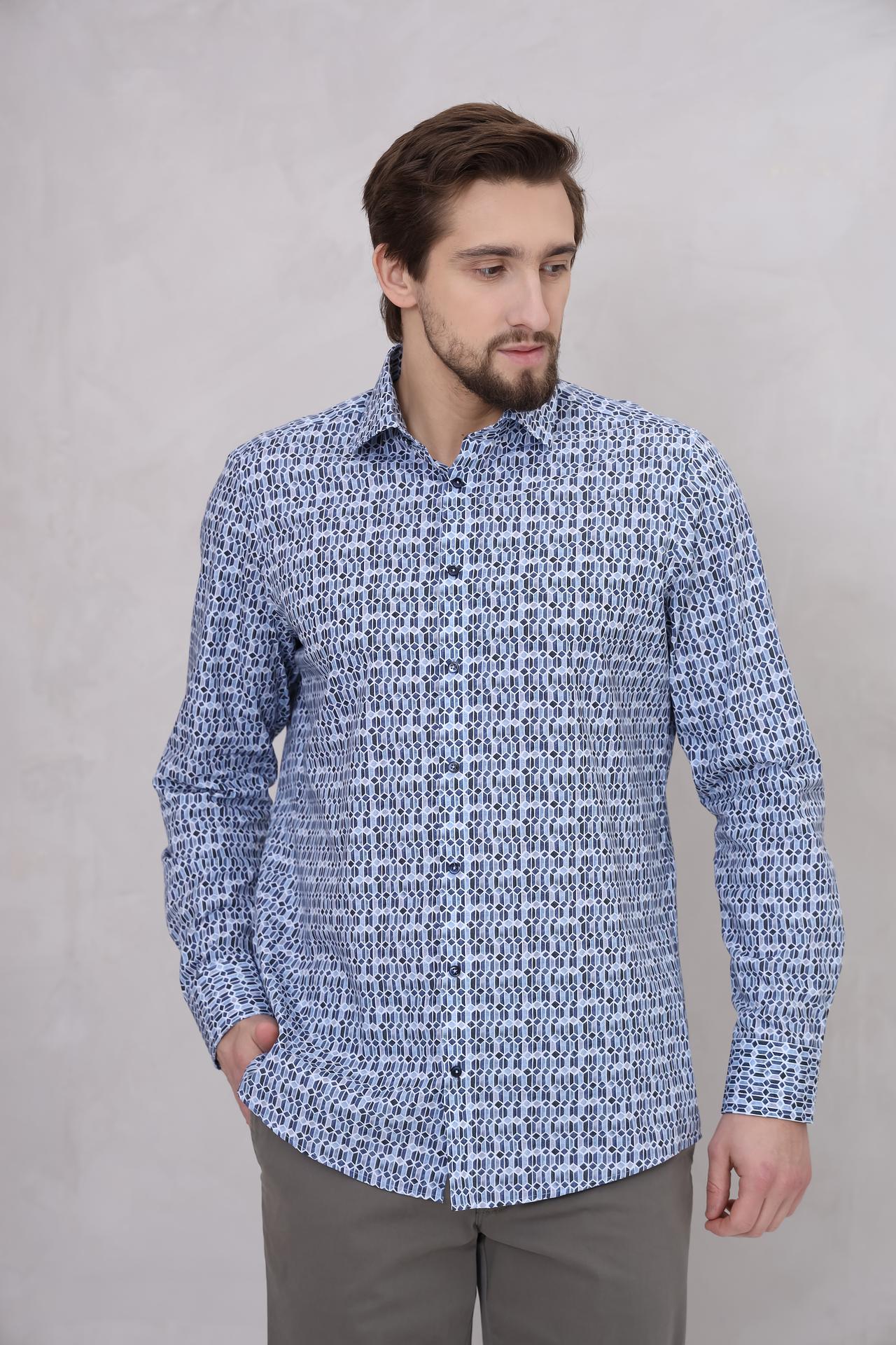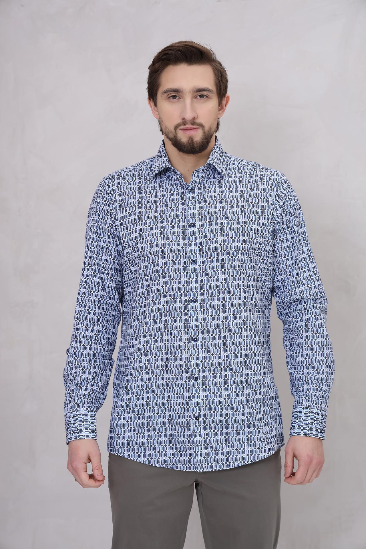 Классический крой и приятный к телу материал делают рубашку универсальной и практичной. Голубой цвет рубашки в сочетании с геометрическим узором придаёт изделию оригинальность и выразительность.