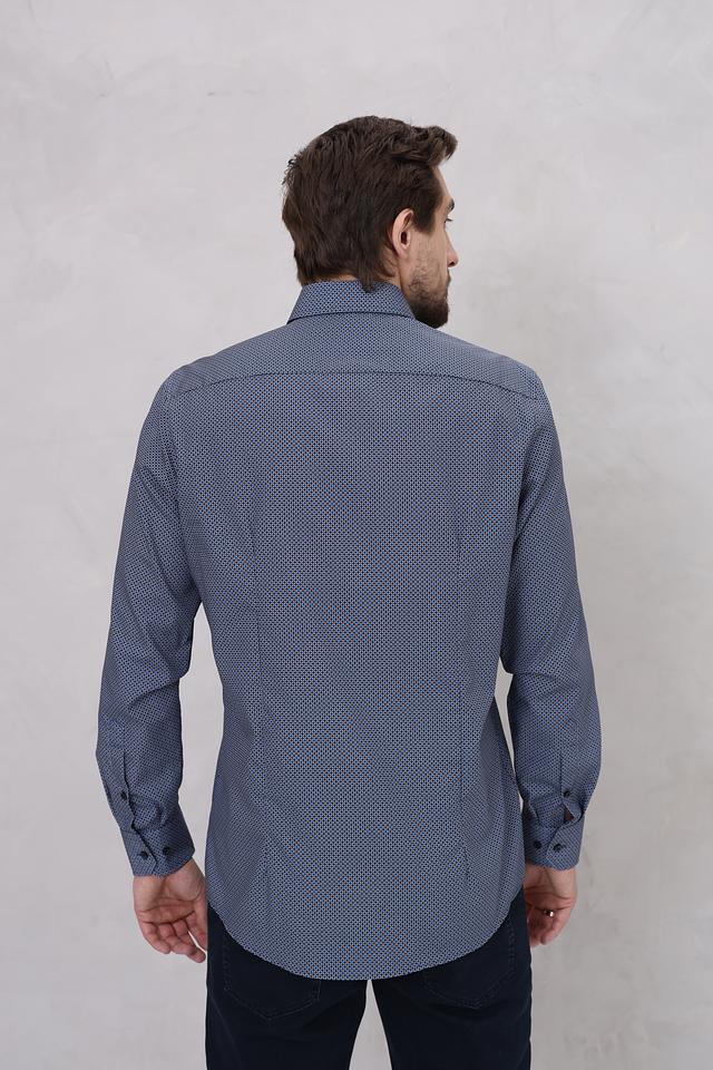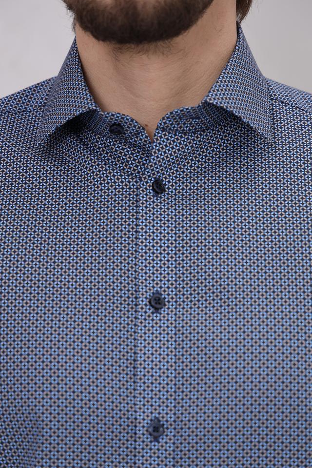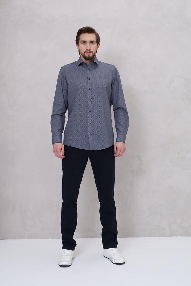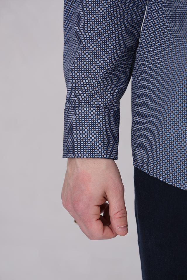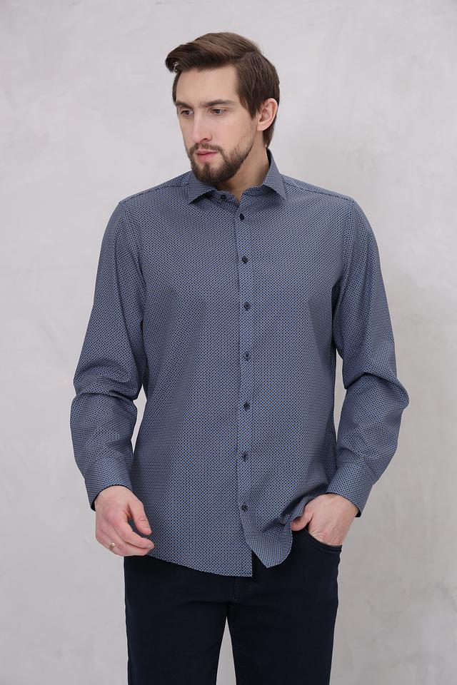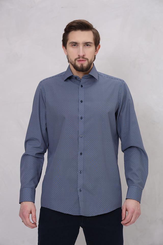 Особенностью данной модели является мелкий геометрический рисунок, который придает ей элегантный и современный вид. Преобладающий цвет рубашки – синий, что делает ее универсальной и легко сочетаемой с другими элементами одежды. Рубашка идеально подойдет для работы, отдыха или особых мероприятий.