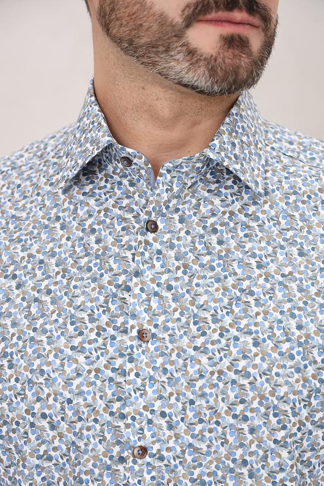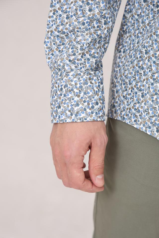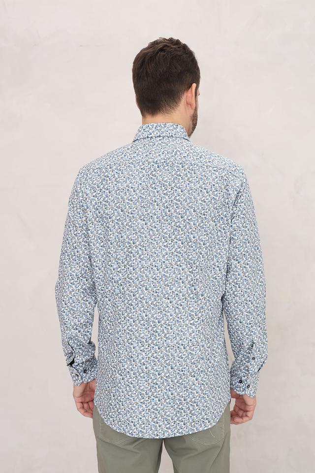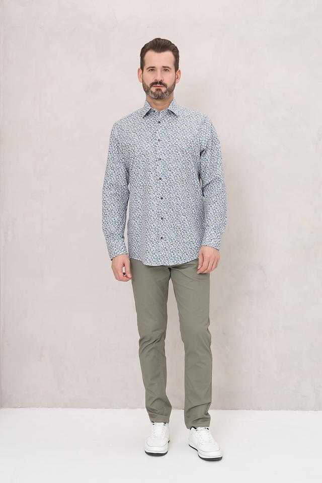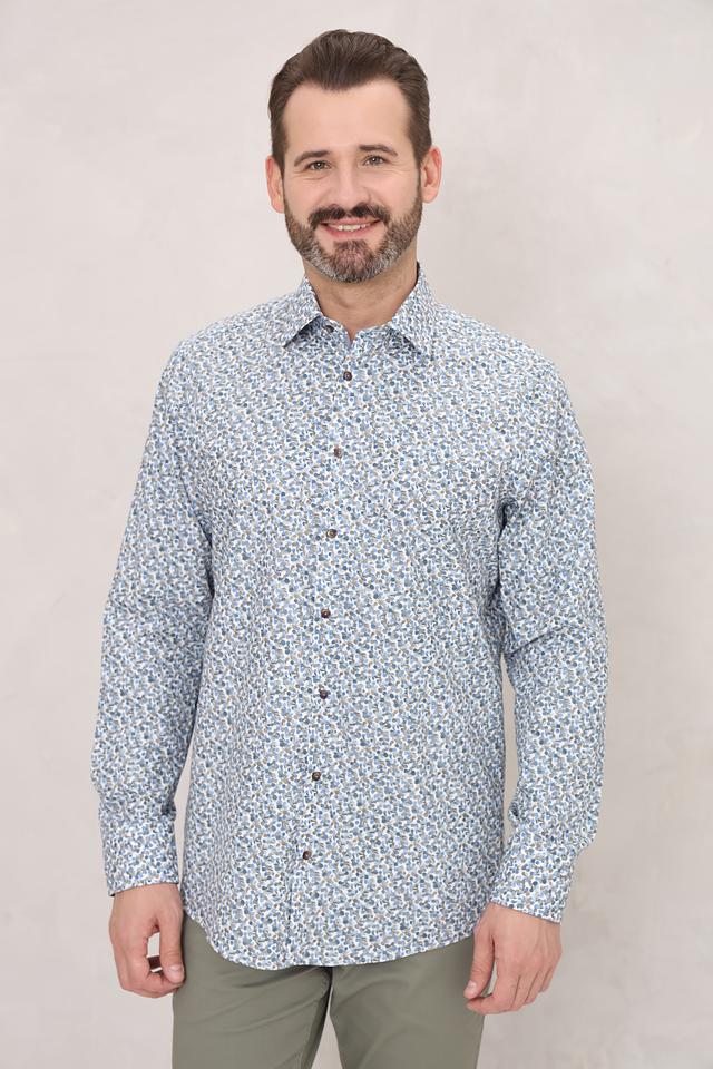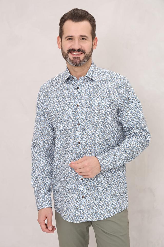 Рубашка имеет классический крой с длинными рукавами и стандартным воротником. Её отличает оригинальный цветочный принт, выполненный в голубых, белых и бежевых тонах, который придаёт ей лёгкость и свежесть.
