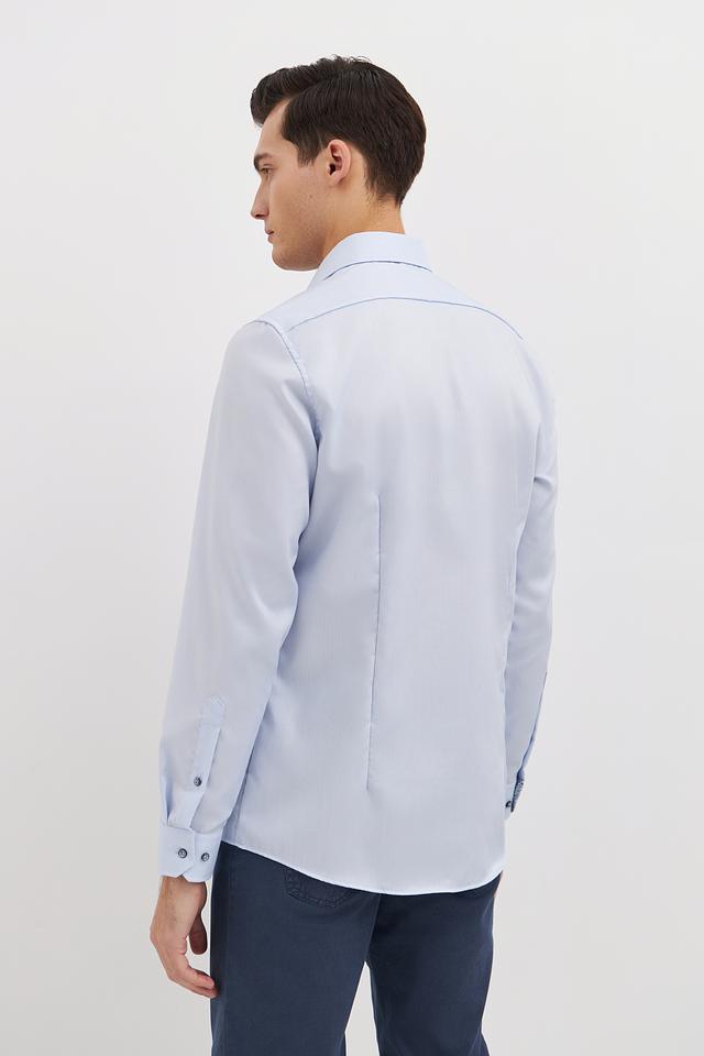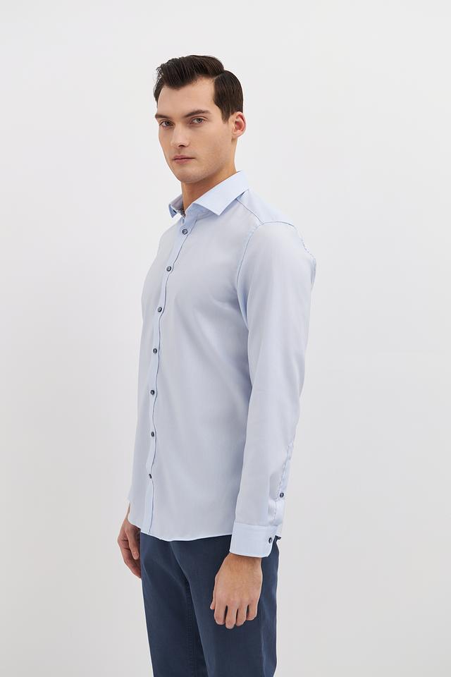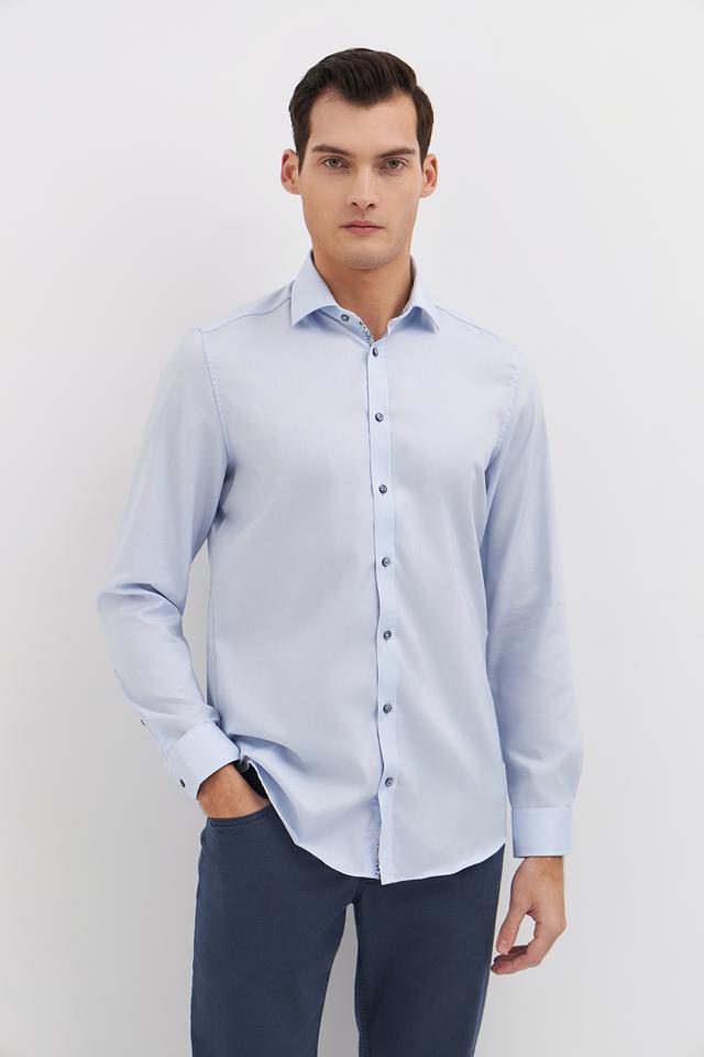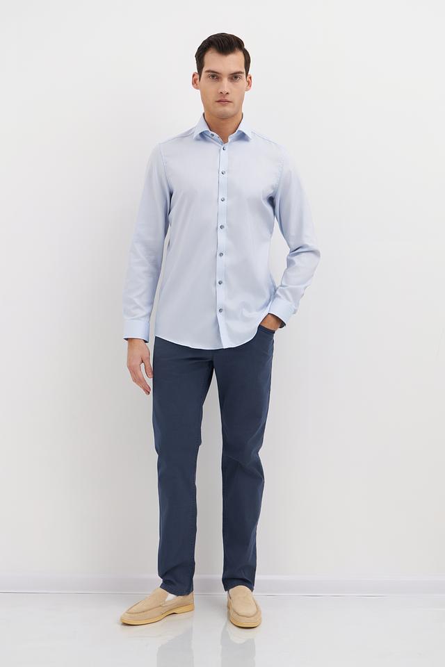 Рубашка имеет классический крой с длинными рукавами и стандартной посадкой. Воротник рубашки выполнен в классическом стиле. Застежка на пуговицах обеспечивает надежную фиксацию.