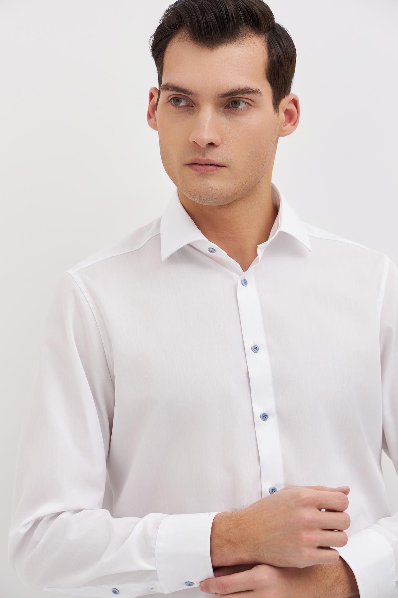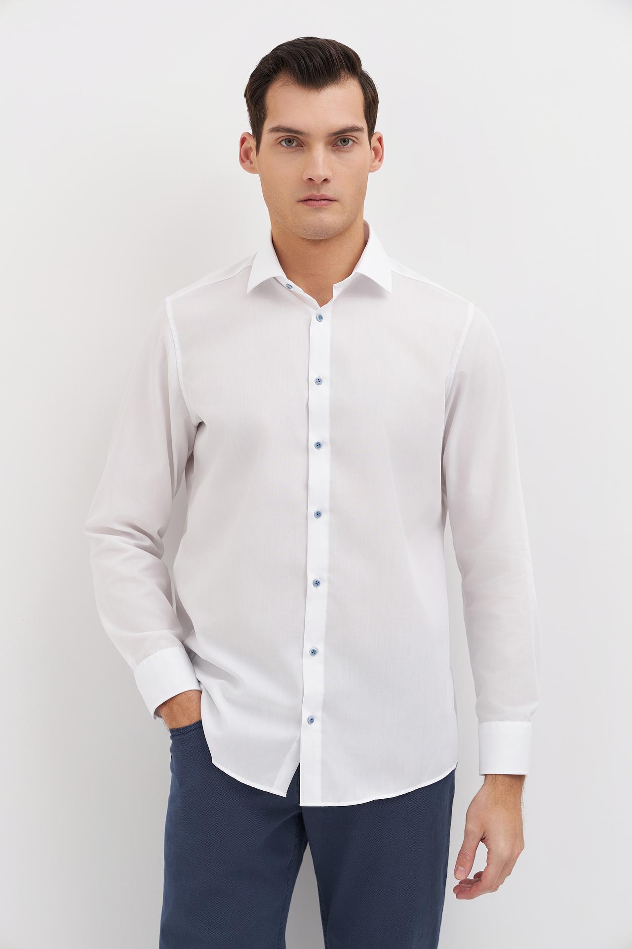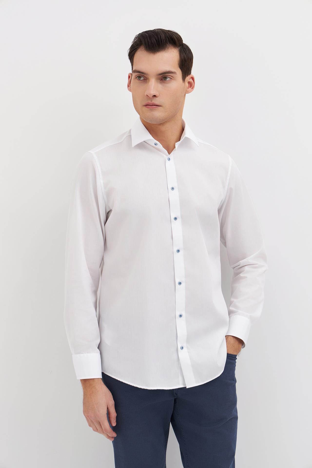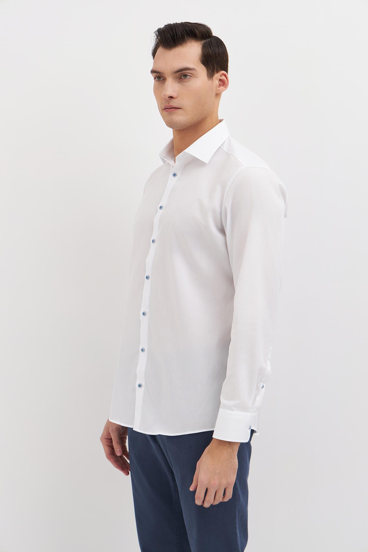 Белый цвет рубашки легко сочетается с различными элементами гардероба, позволяя создавать разнообразные образы. Голубые пуговицы добавляют изюминку и делают рубашку более интересной.
