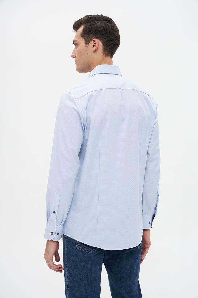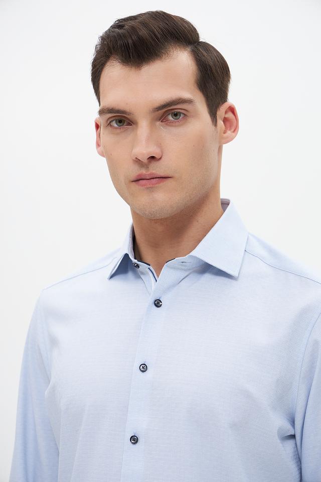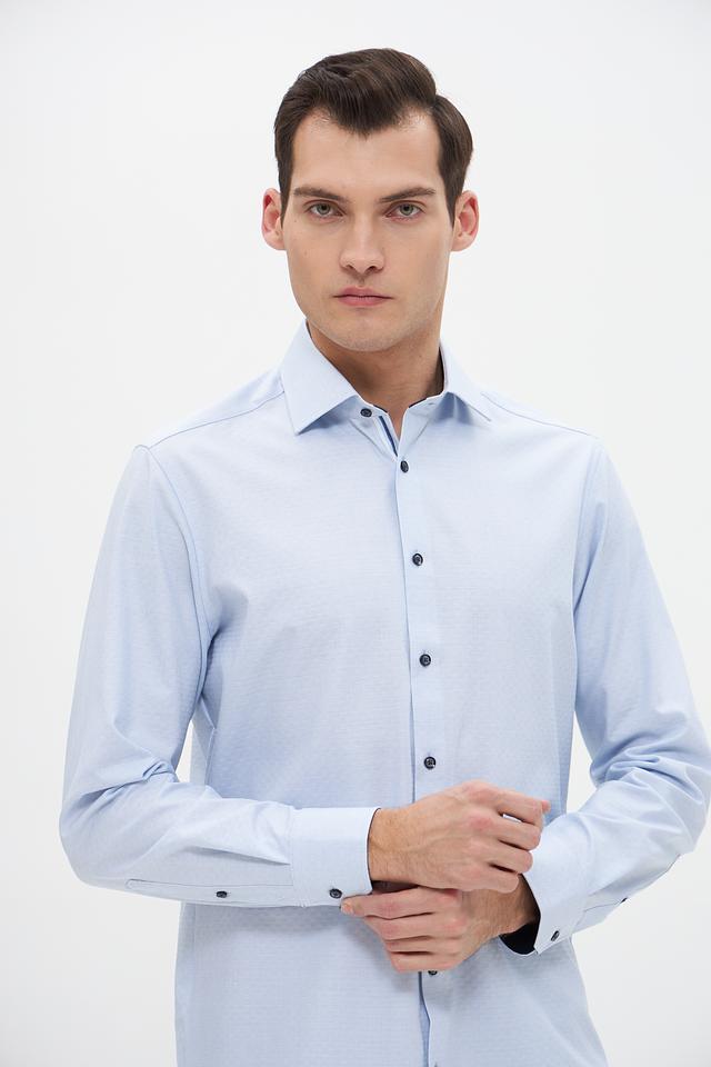 Рубашка имеет классический крой с приталенным силуэтом, что обеспечивает комфортную посадку по фигуре. Длинные рукава с манжетами на пуговицах позволяют регулировать их длину. Воротник рубашки классической формы, идеально подходит для ношения с галстуком или без него.