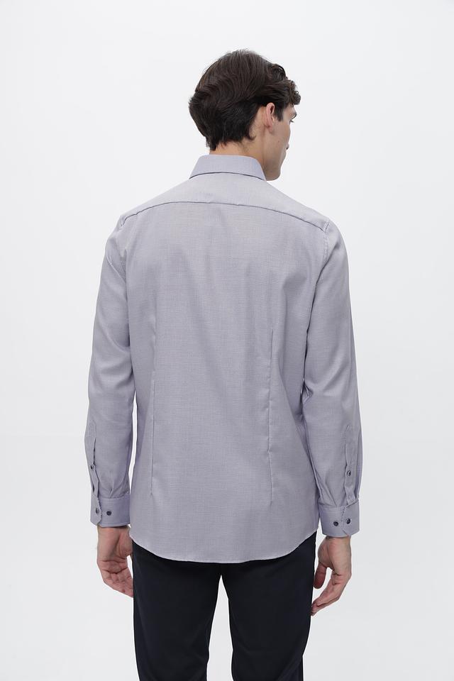 Рубашка имеет классический крой с длинными рукавами и приталенный силуэт. Застежка на пуговицы по всей длине. Воротник рубашки классической формы.