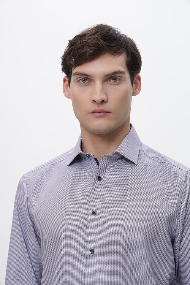 Особенностью данной модели является мелкий геометрический принт, который придает рубашке стильный и современный вид. Рубашка идеально подойдет для создания как деловых, так и повседневных образов. Она хорошо сочетается с брюками, джинсами и пиджаками.