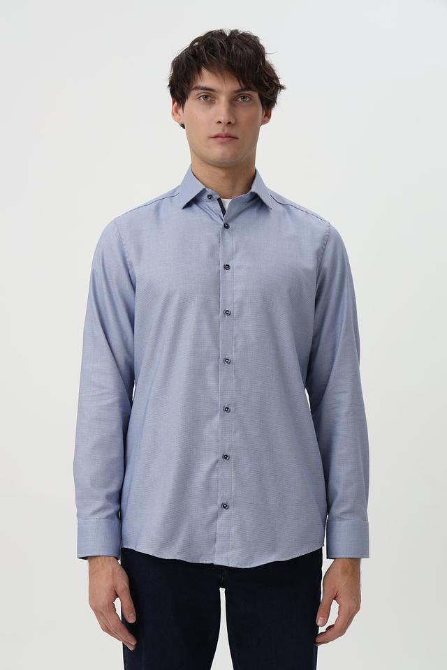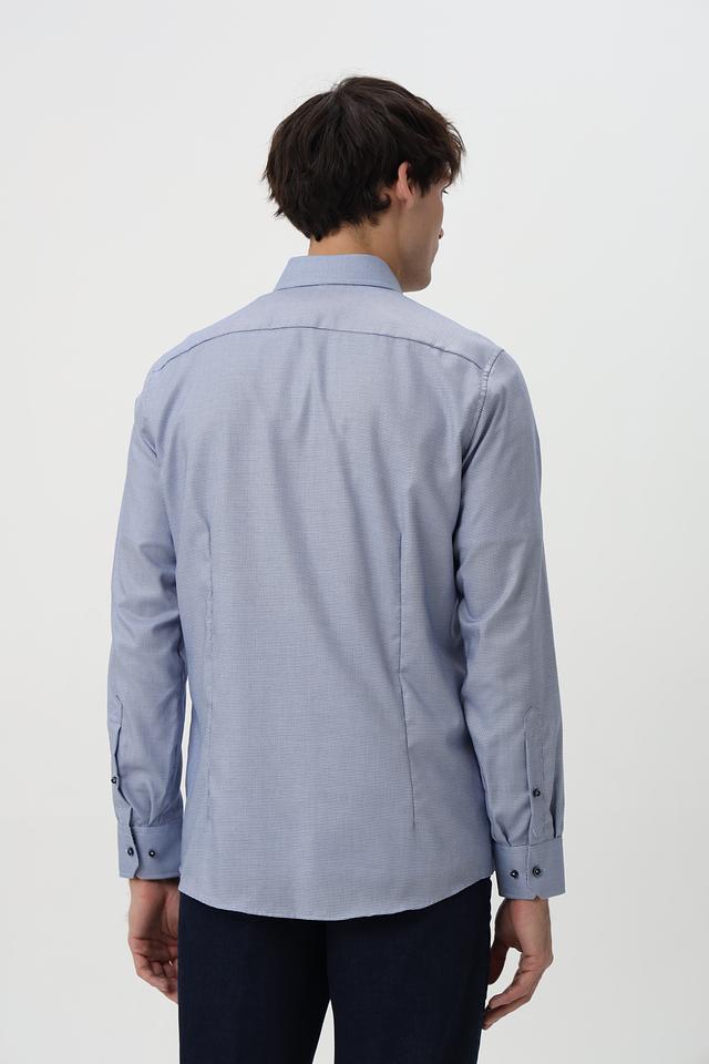 Рубашка голубого цвета с мелким рисунком в клетку, выполненным в синих и белых тонах. Классический воротник и манжеты на пуговицах придают рубашке элегантный вид. Прямой крой (modern fit) обеспечивает удобную посадку по фигуре.