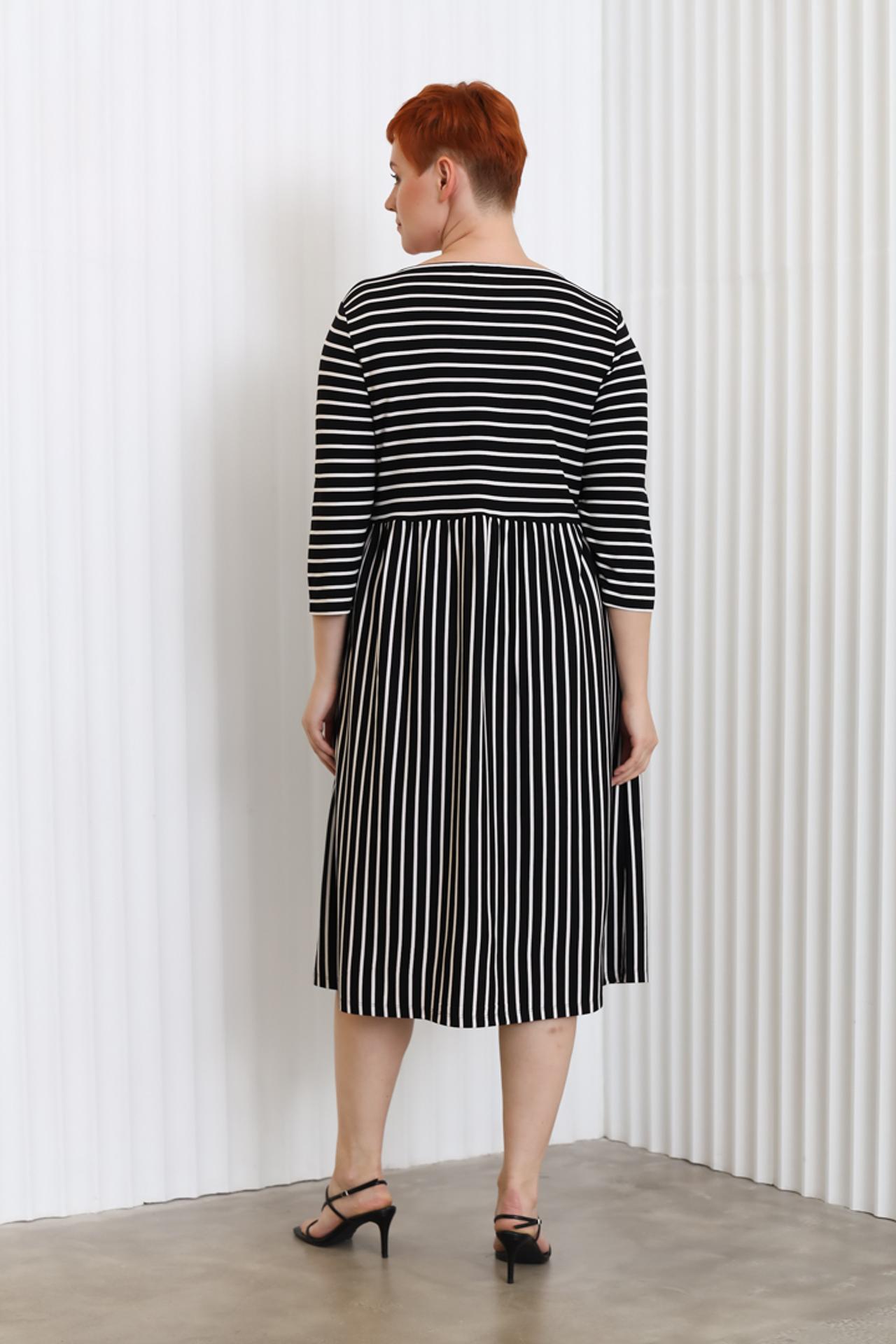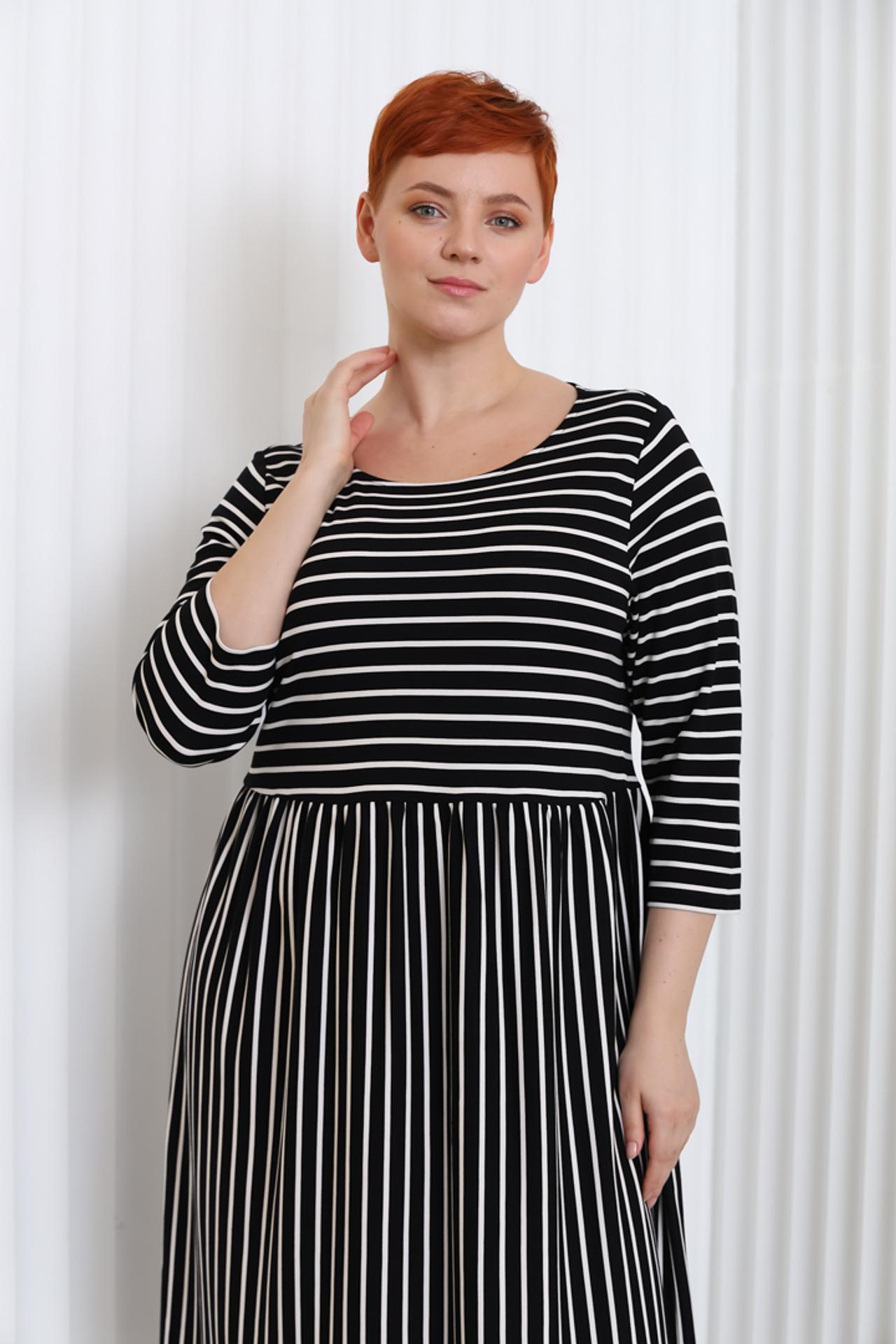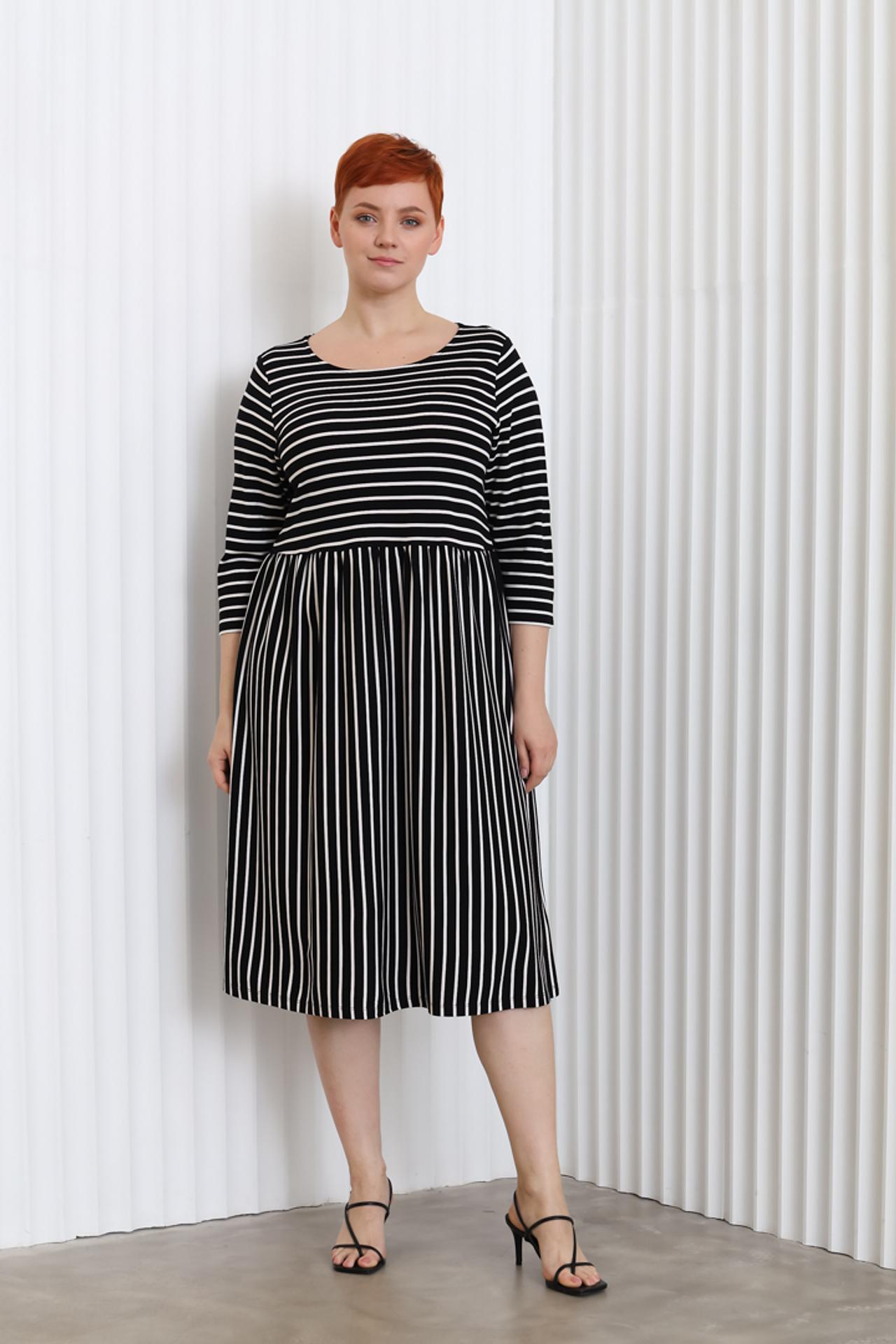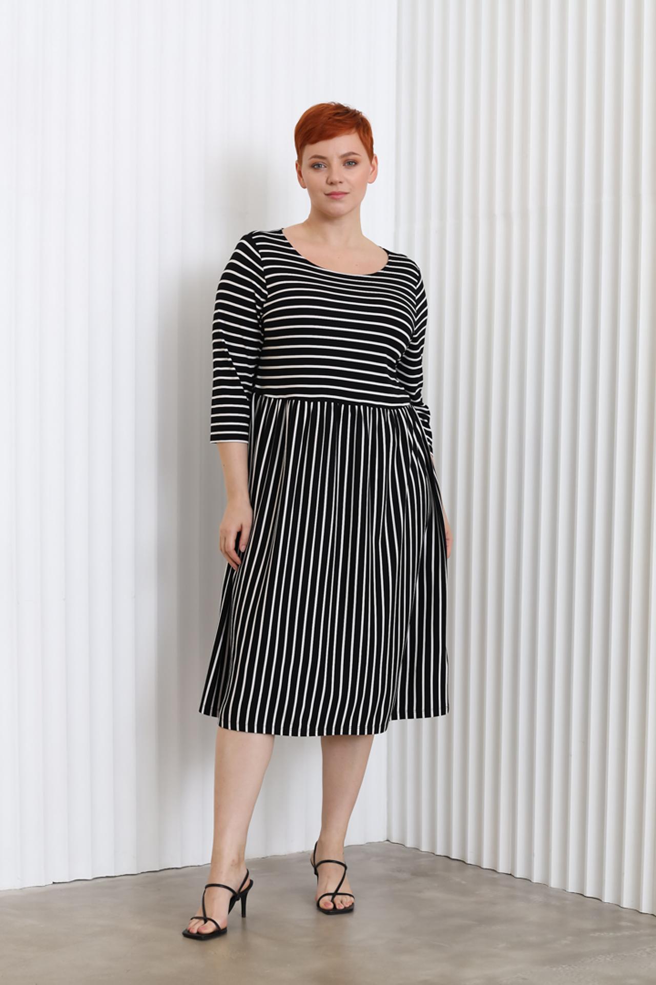 - Дизайн: Классический крой с расклешенной юбкой и рукавами 3/4. Контрастная полоска – актуальный тренд, который никогда не выходит из моды. Круглый вырез горловины деликатно подчеркивает шею.