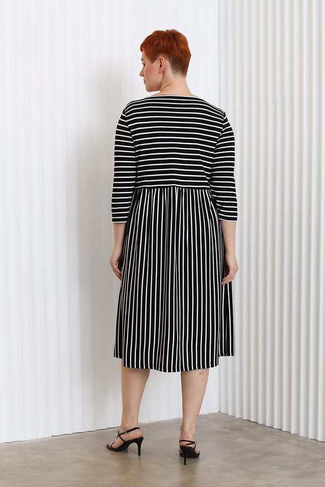 Это платье от Via Appia – идеальный выбор для тех, кто ценит комфорт и стиль. Модель выполнена в классическую чёрно-белую полоску, которая визуально стройнит и подходит практически к любому типу внешности.
