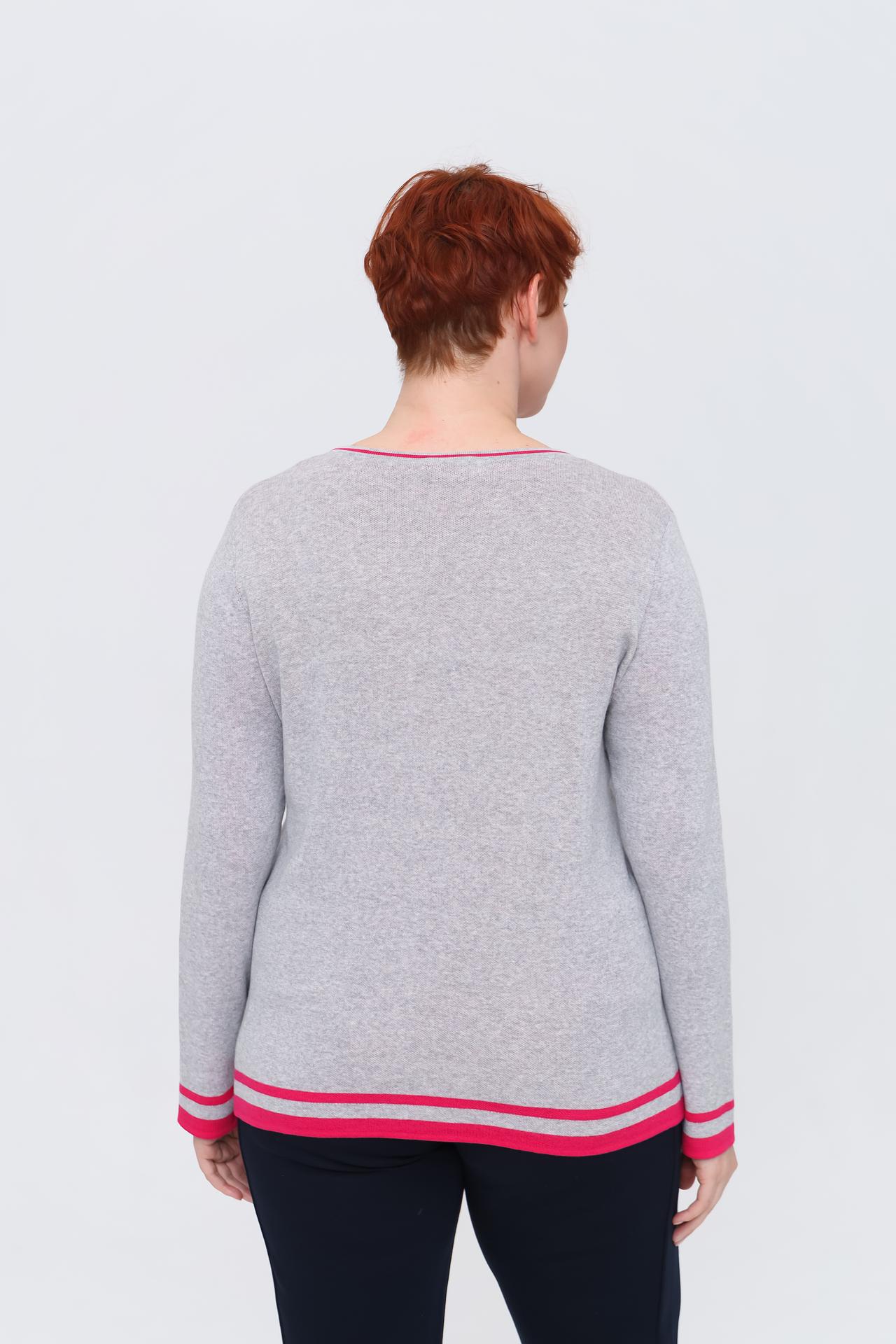 - Цвет: Основа пуловера - универсальный серый меланж, который легко сочетается с различными элементами одежды. Малиновый принт и отделка создают выразительный контраст.