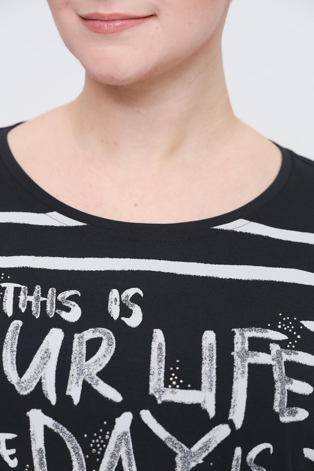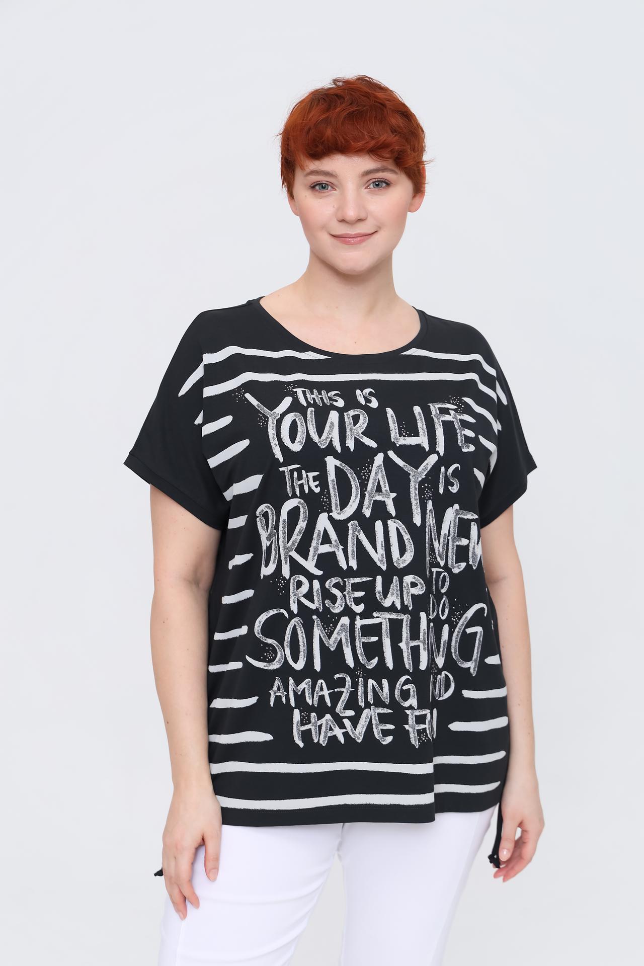 - Дизайн: Чёрная футболка с контрастным принтом и декоративными стразами. Оригинальный принт делает эту модель яркой и запоминающейся.