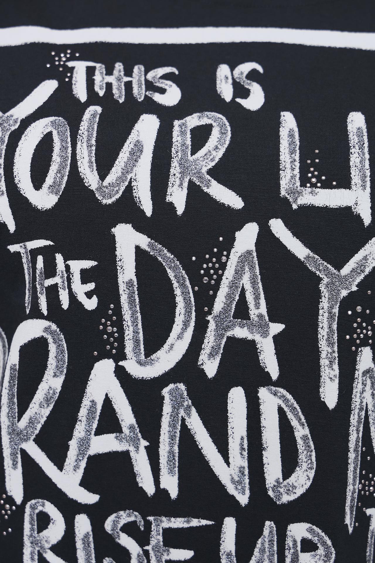 Футболка прямого кроя от Via Appia – идеальный выбор для создания стильных и комфортных образов на каждый день. Модель выполнена в классическом чёрном цвете и украшена оригинальным принтом с надписью и мерцающими стразами, добавляющими изысканности.