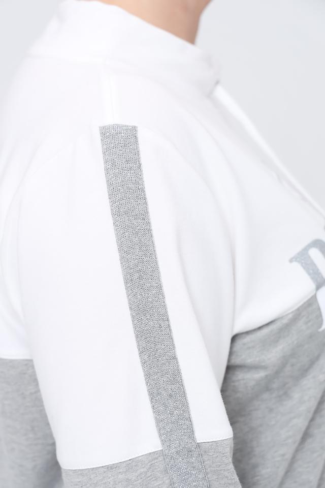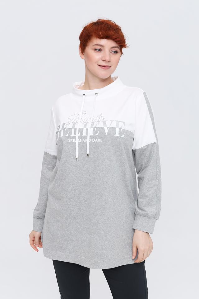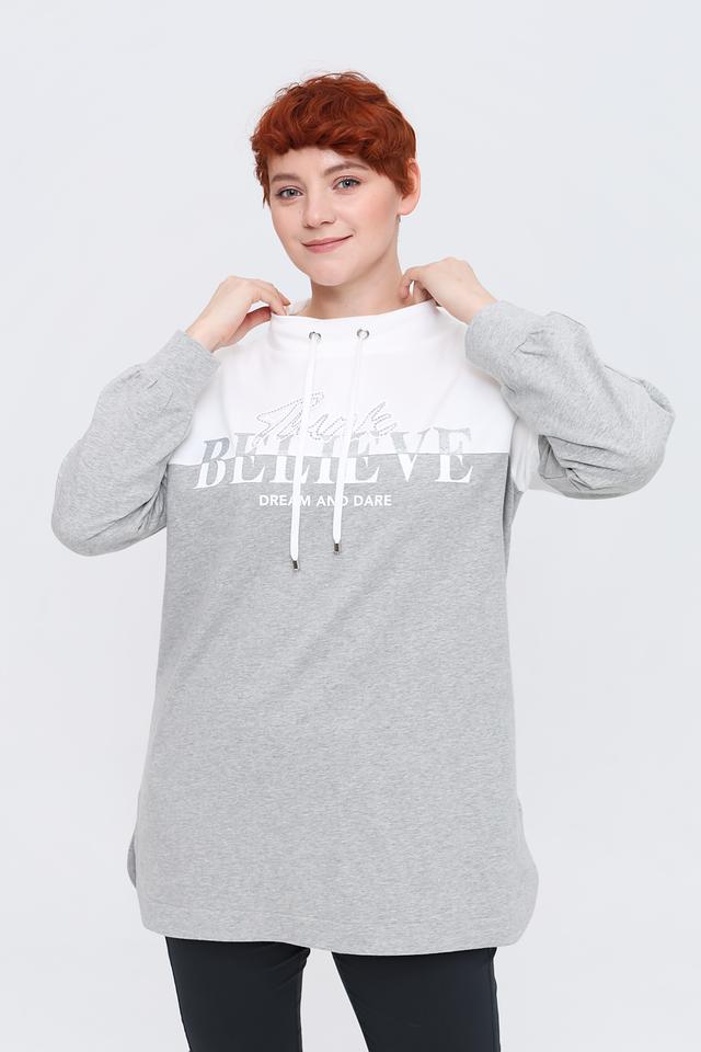 Модель выполнена в сочетании серого и белого цветов, с ярким принтом на лицевой стороне. Пуловер имеет свободный крой, что делает его идеальным для повседневной носки. Капюшон дополнен шнурками.