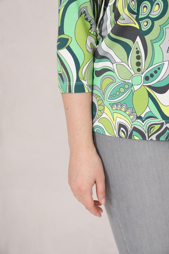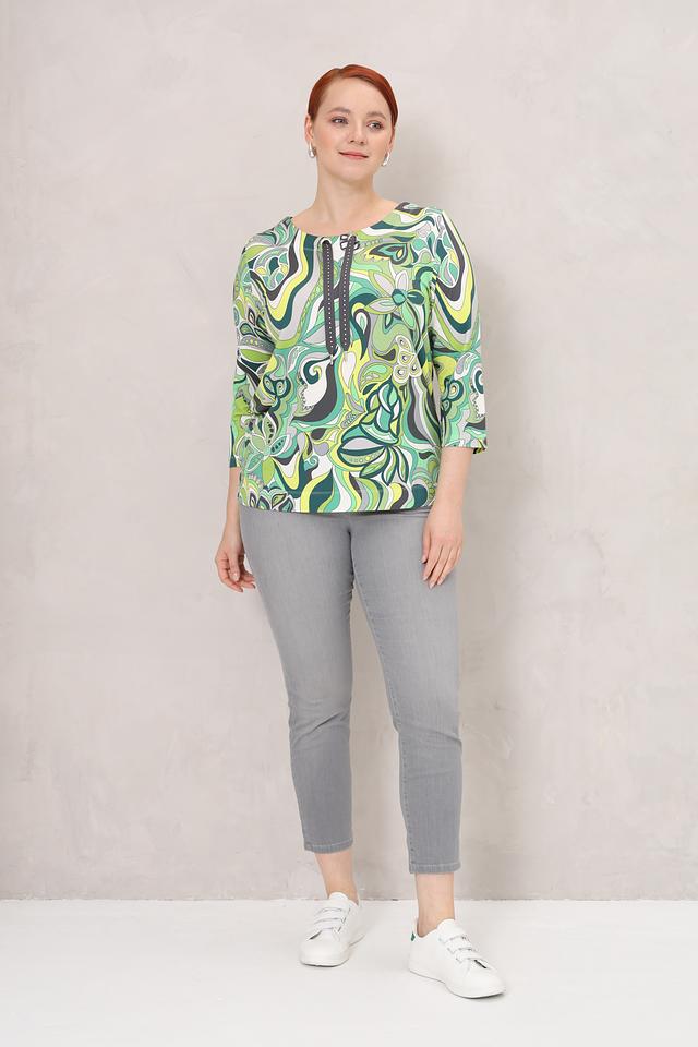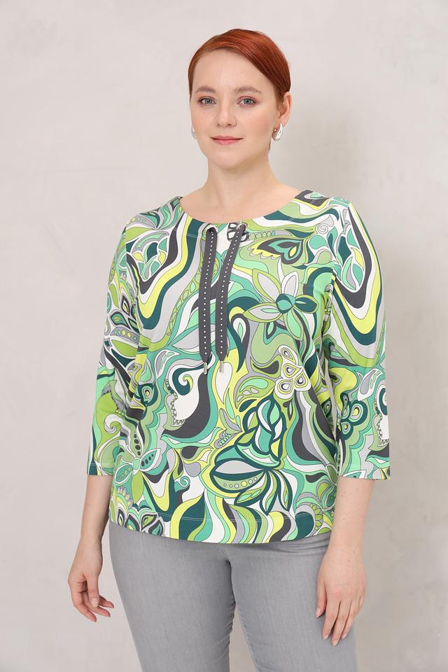 Блуза имеет оригинальный принт в абстрактном стиле, выполненный в различных оттенках зеленого. Вырез горловины дополнен шнурком с металлическими кольцами, что придает модели особый шарм.