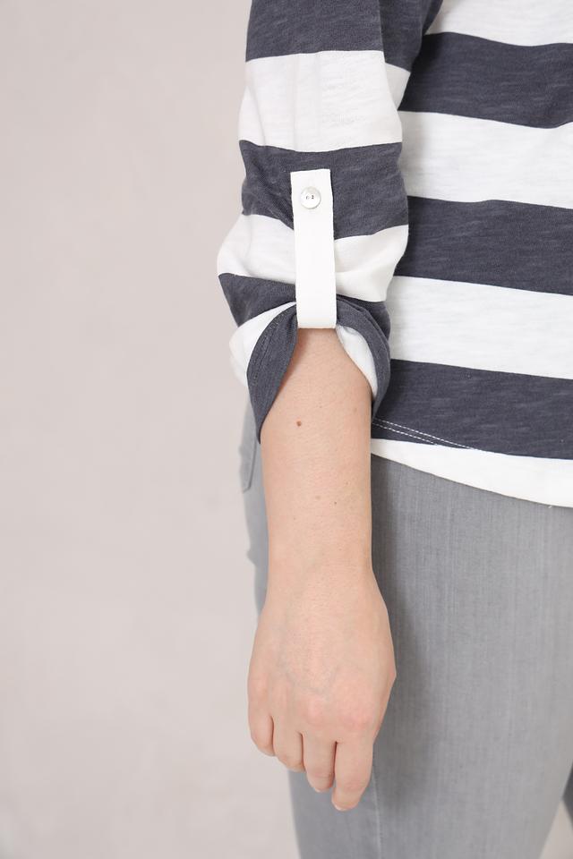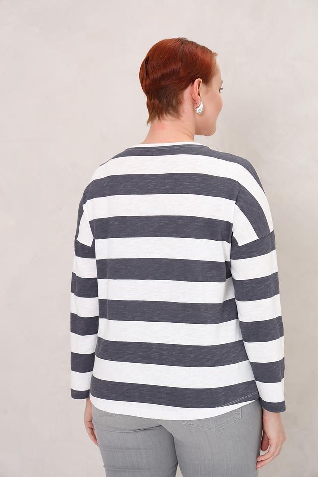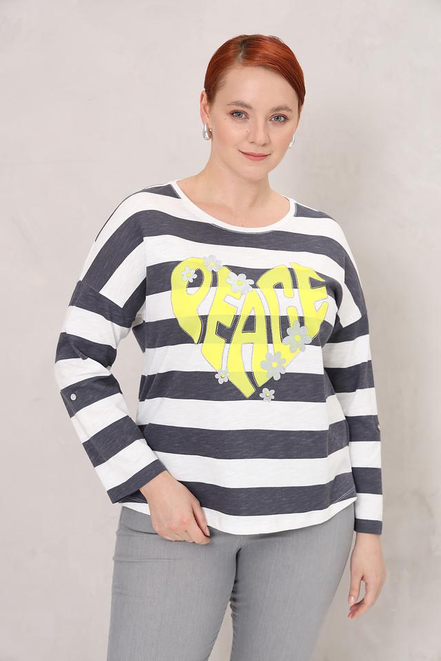 Лонгслив выполнен в классической полосатой расцветке, сочетающей серый и белый цвета. На передней части изделия расположен яркий принт в виде сердца, выполненного в жёлтом цвете и украшенного небольшими цветочными элементами.