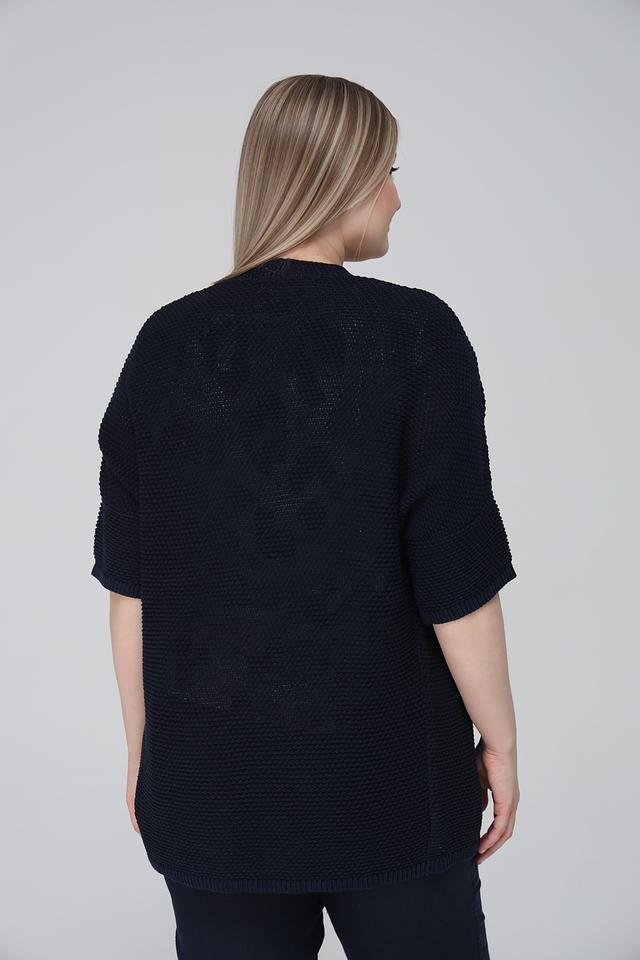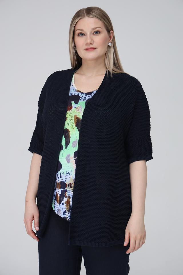 Жакет имеет короткий рукав 3/4 и свободный крой, что обеспечивает комфорт в носке. Фактурная вязка придает изделию оригинальность и визуальный интерес.