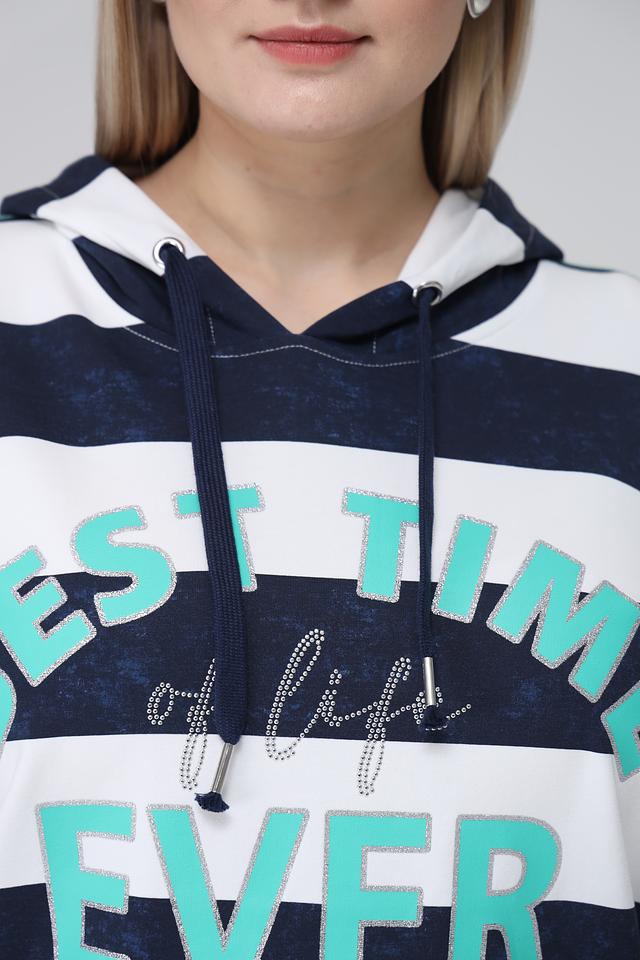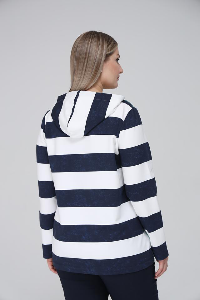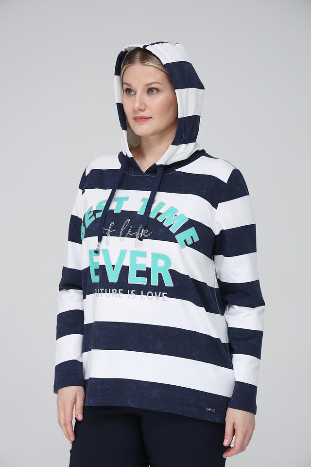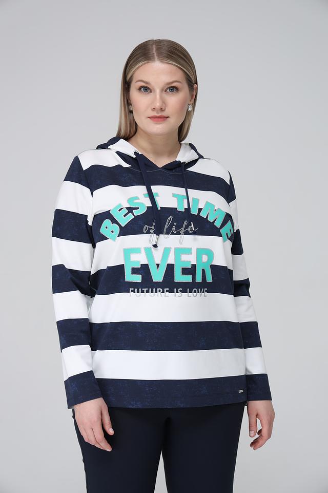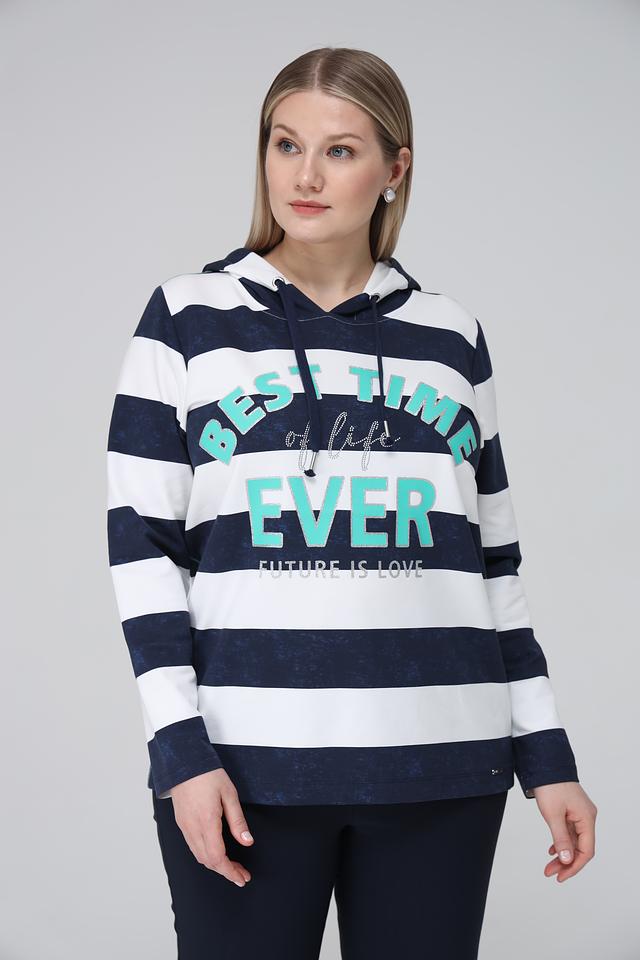 Женский пуловер Via Appia синего и белого цвета с капюшоном и ярким принтом. Модель выполнена в полоску и украшена надписью, станет отличным дополнением к вашему образу. Состав: хлопок 95%, эластан 5%
