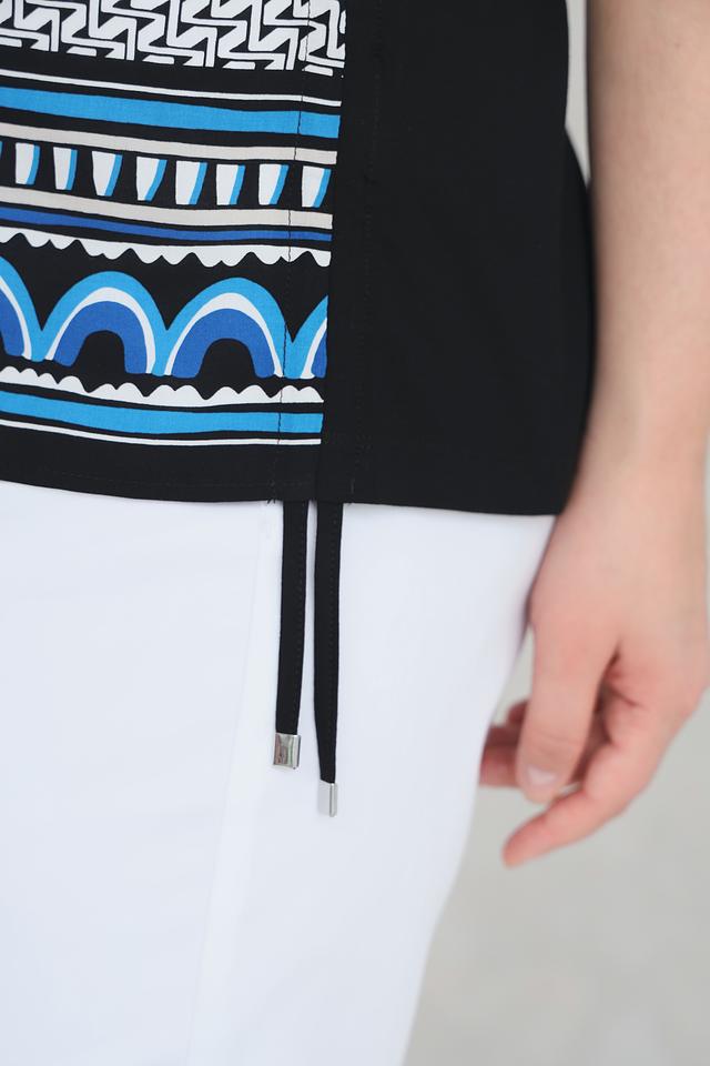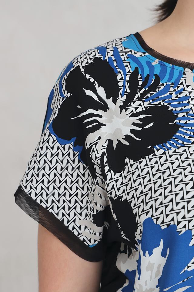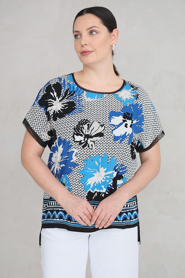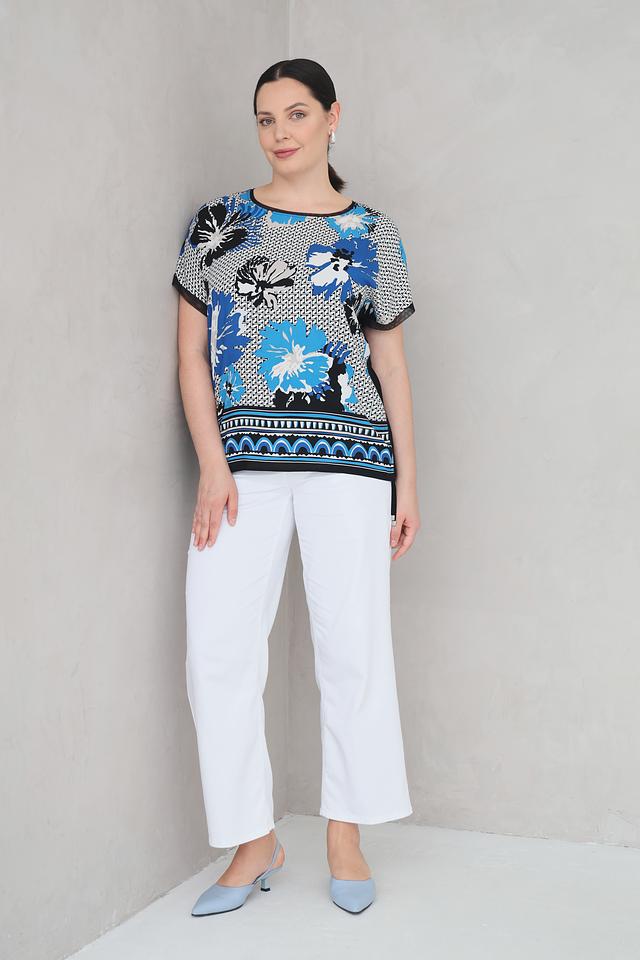 Особенностью данной модели является яркий цветочный принт, сочетающий в себе оттенки синего, белого и черного. Декоративная полоса с геометрическим узором в нижней части блузы добавляет ей оригинальности.