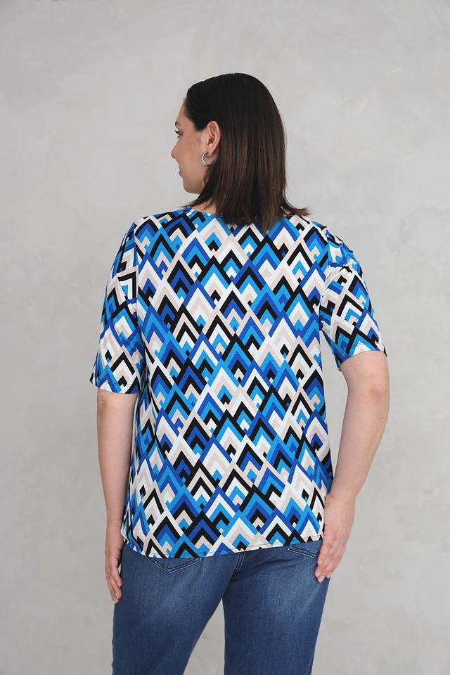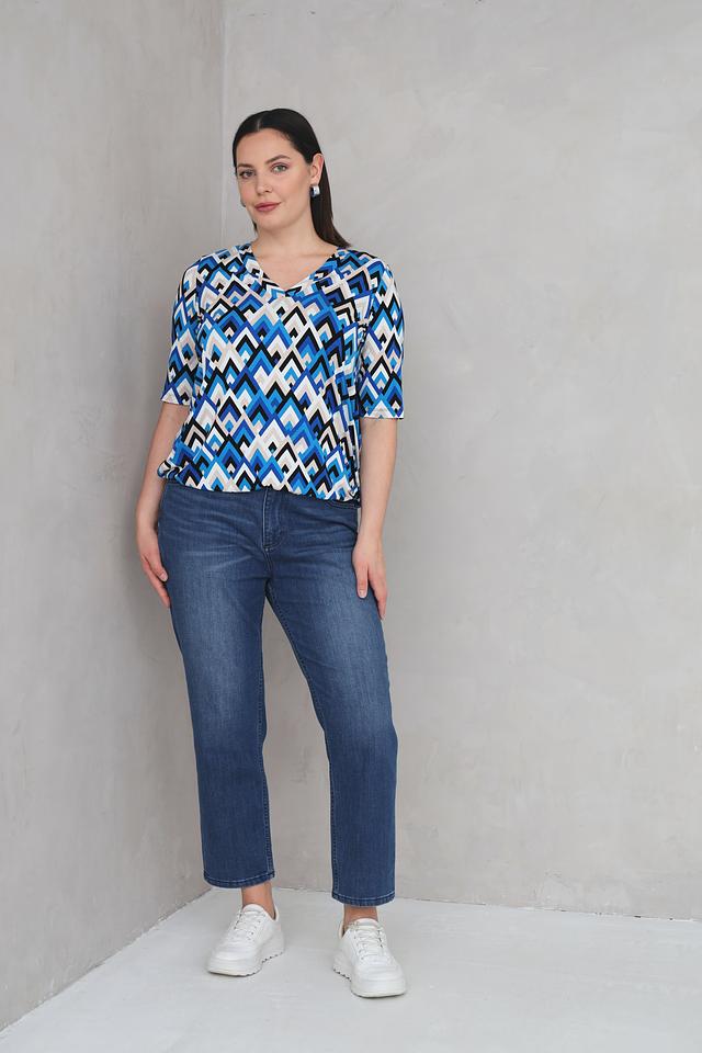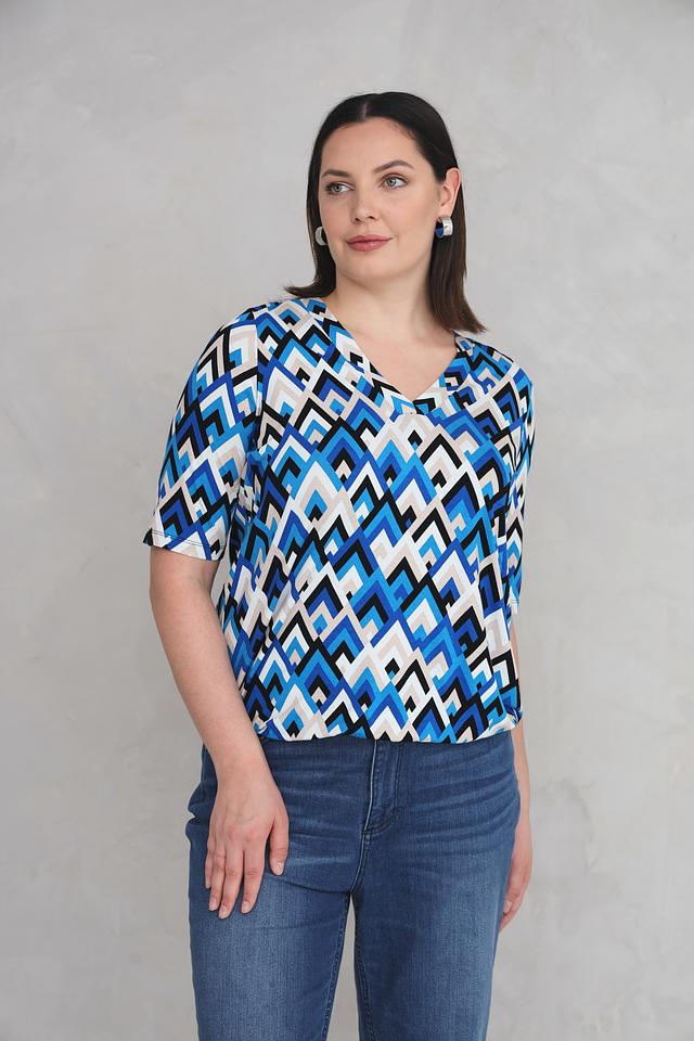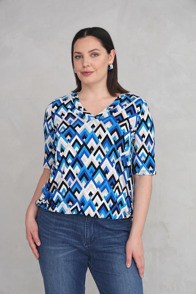 Особенностью данной модели является яркий геометрический принт в синих, белых и черных тонах. V-образный вырез горловины и короткие рукава делают футболку универсальной и подходящей для различных случаев.