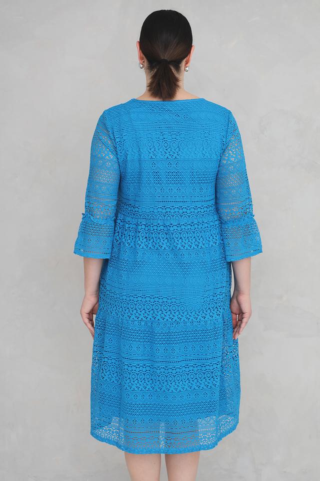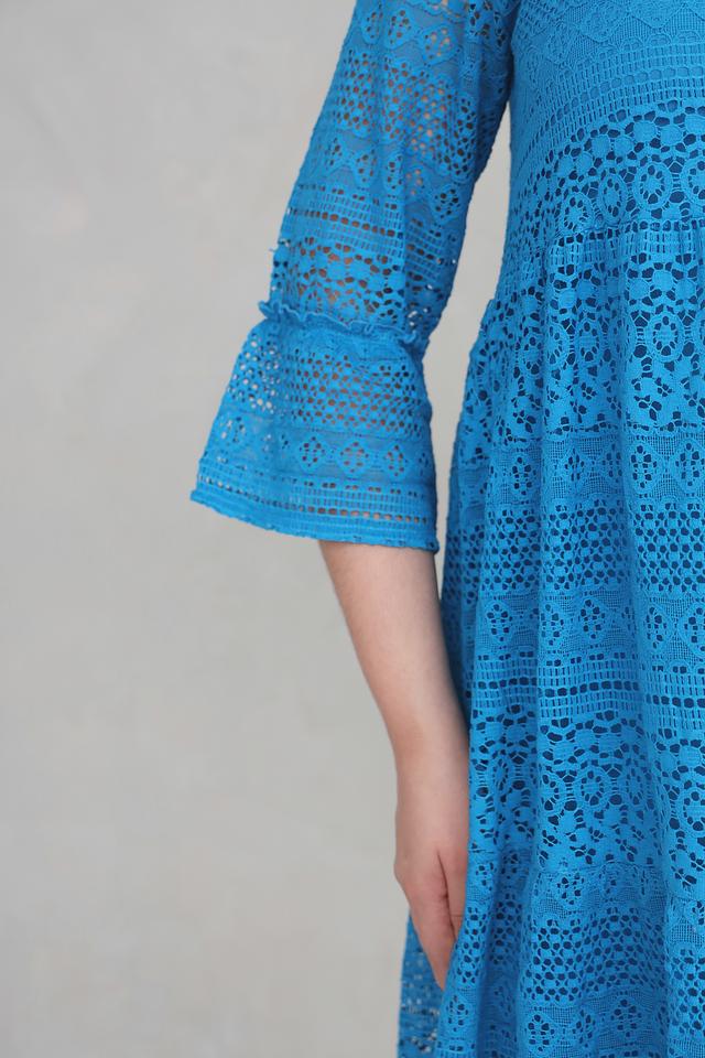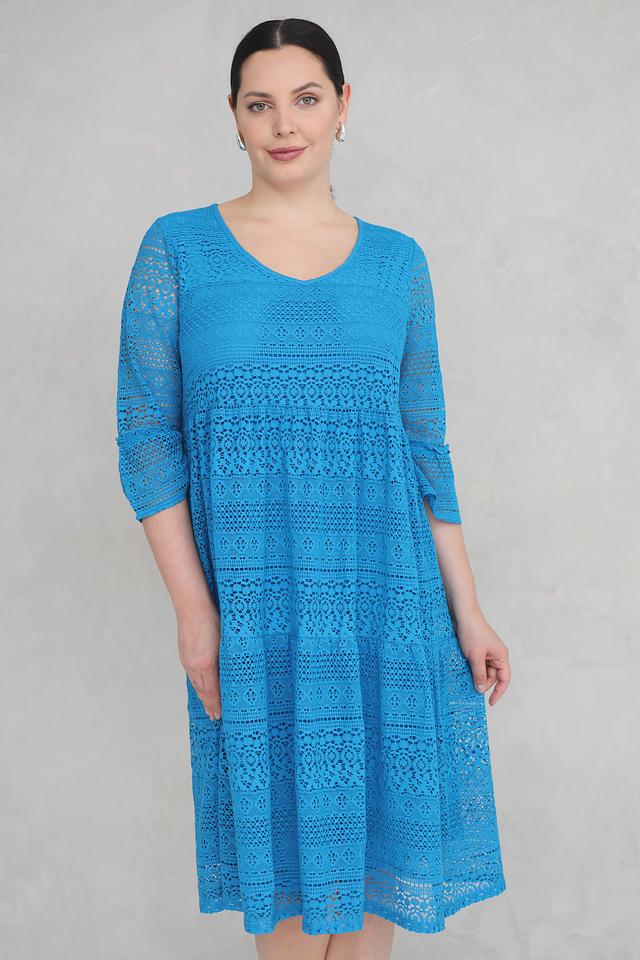 Платье имеет яркий бирюзовый цвет и полностью выполнено из ажурного кружева, что придает ему особую изысканность и воздушность. V-образный вырез горловины и рукава длиной 3/4 подчеркивают женственность силуэта.