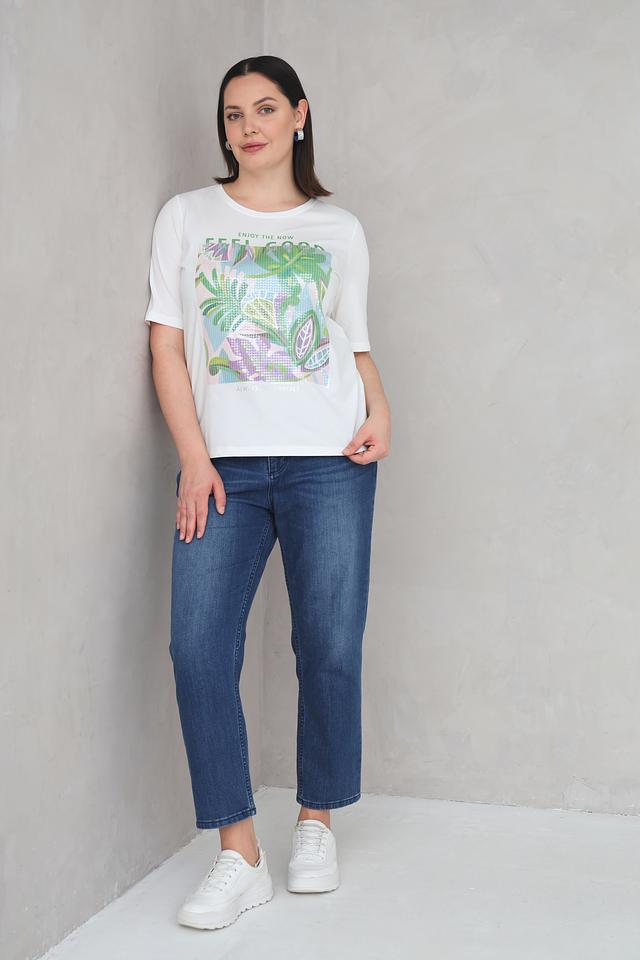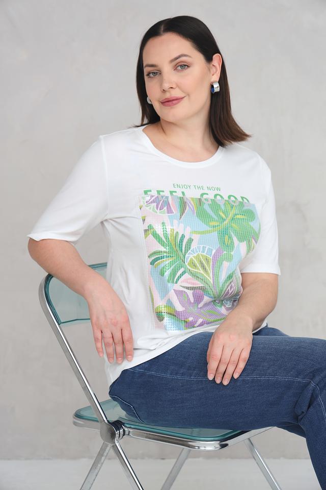 Основным акцентом футболки является яркий и красочный тропический принт, который добавляет образу свежести и летнего настроения. Надпись "ENJOY THE NOW" придает футболке позитивный и вдохновляющий посыл.