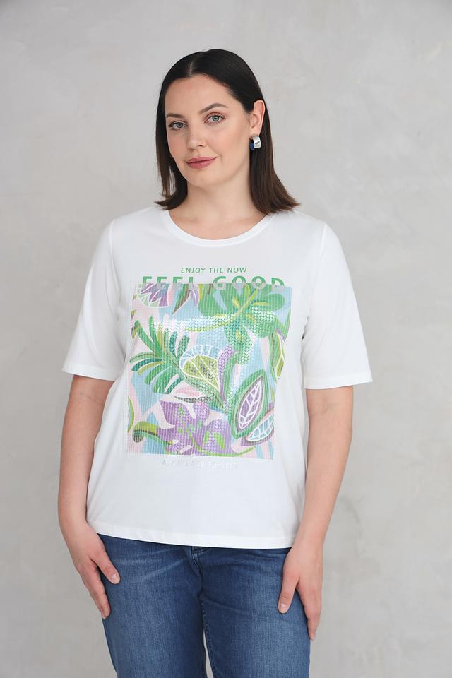 Белая футболка Via Appia с ярким тропическим принтом и надписью "ENJOY THE NOW". Изготовлена из 100% хлопка, обеспечивая комфорт и воздухопроницаемость. Идеальный выбор для создания летнего и непринужденного образа. Состав: хлопок 100%