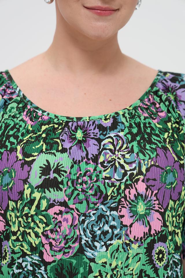Модель имеет свободный крой, который не сковывает движения и обеспечивает комфорт в течение всего дня. Круглый вырез горловины и короткие рукава делают эту блузу подходящей для теплой погоды.